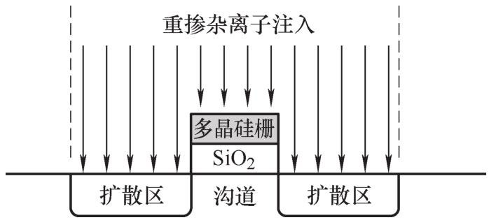 如图2.8所示为多晶硅栅自对准工艺示意图,这种工艺要先制作多晶硅栅,然后横跨多晶硅栅进行整体的扩散区离子注入,由于离子不能穿过多晶硅栅,这样就在多晶硅栅的下面天然地形成了沟道,栅的两侧形成源区和漏区,实现了栅与沟道的自对准。另外,制作栅的多晶硅本身导电性极差,而在进行源漏注入时,多晶硅栅也被进行了离子注入,进行离子注入后其导电性会大大提高。所以在自对准工艺中,对源漏扩散区注入的同时,多晶硅栅也得到了注入,天然地解决了多晶硅栅的导电性问题。需要指出的是,实际工艺中的离子注入角度与图中垂直向下不同,需要7°~9°的倾斜,有关这个问题将在第6章的倾斜角度离子注入部分进行详细说明。