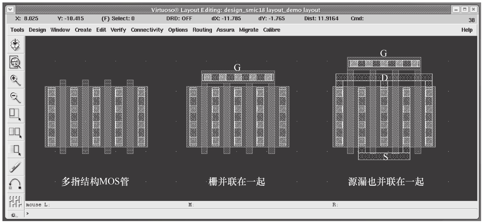 有时MOS管的宽长比( W / L )会很大,造成版图很细很长,这时需要采用多个短MOS管并联的结构,即多指结构。如图2.11所示为多指结构MOS管版图,左侧是一个4栅多指结构MOS管版图,每条栅代表一个MOS管,栅两侧为S和D扩散区,相邻MOS管共用S和D。中间是把栅并联起来的版图,可以看出,用GT层直接把各个栅连接起来,再打上接触孔,连接到M1即可。右侧是将源漏也并联在一起的版图,它是多指结构MOS管最终的版图样子。
