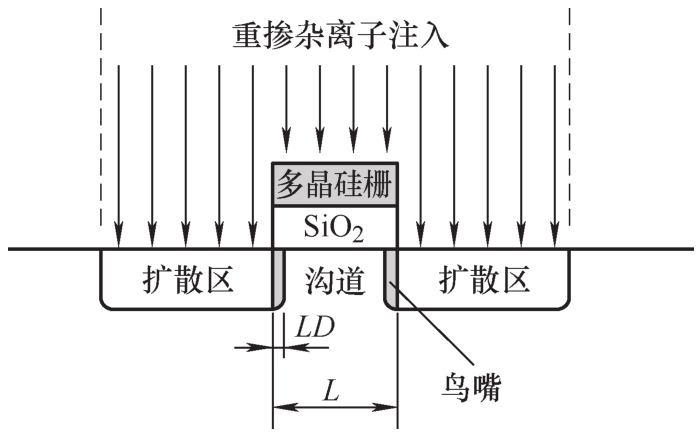 如图2.12所示,在进行离子注入时,离子除了纵向扩散之外,还会横向扩散,横向扩散部分被称为鸟嘴,在Spice模型中用参数 LD 描述。鸟嘴不仅使有效栅长 L eff ( L eff = L -2 LD )减小,而且还会增加栅极与源极、漏极之间的交叠电容,不仅影响器件的高频特性,而且还会在采样保持电路中造成时钟馈通(Clock Feedthrough)。