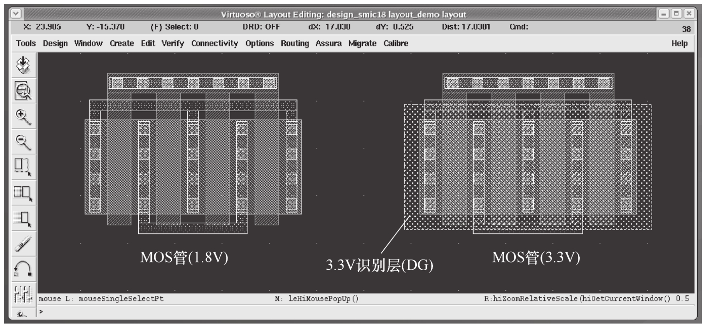 随着CMOS工艺的不断发展,MOS管的栅氧层厚度也越来越薄,击穿电压也越来越低,而且同一个工艺可以支持多种电压的MOS管。以0.18μm工艺为例,其核心电路电源电压为1.8V,为了支持3.3V的电路设计,0.18μm工艺也提供3.3V的MOS管,1.8V与3.3V的MOS管在版图结构上基本相同,主要区别在于栅氧层厚度不同。图2.13是1.8V和3.3V的MOS管版图对比,左边是1.8V的MOS管,右边是3.3V的MOS管,每个MOS管都由4个MOS管并联构成。这两种MOS管的版图结构基本相同,差别在于3.3V的MOS管额外增加了3.3V识别层,这个识别层用于指导工艺流程,将它所覆盖的栅氧层生长得厚一些。