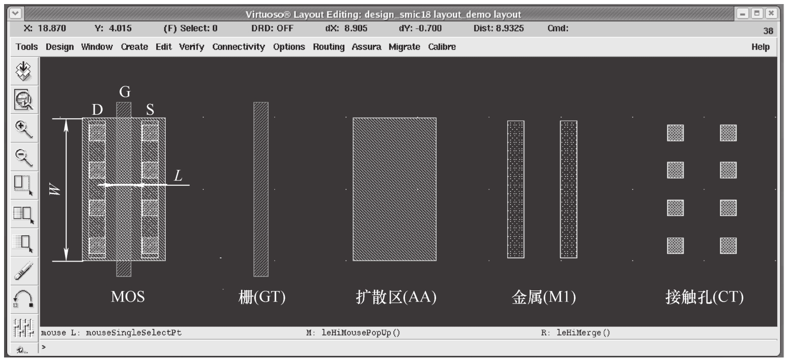在进行集成电路工艺加工之前,需要预先设计好扩散区、栅、金属线条和接触孔等的图形,这些图形就是版图。如图2.9所示为多晶硅栅MOS管的版图,最左侧为MOS管完整版图,旁边是MOS管各个图层的分解图,包括栅(GT)、扩散区(AA)、金属(M1)和接触孔(CT)。从分解图中可以看出,扩散区(AA)是一个整体,由于多晶硅栅的遮挡,实际形成的扩散区被分成了两个独立的部分,分别为源区(S)和漏区(D),多晶硅栅与扩散区的交叠部分称为沟道,在源漏区上打接触孔,通过金属(M1)拉出电极D和S。图中MOS管源漏扩散区之间的距离定义为沟道长度 L ,扩散区的宽度定义为沟道宽度 W ,大部分情况下 L 小于 W ,这有些不太符合人们的基本认知习惯。栅伸出扩散区的部分是为了确保在一定的工艺误差下,栅极仍然能完整跨过扩散区。