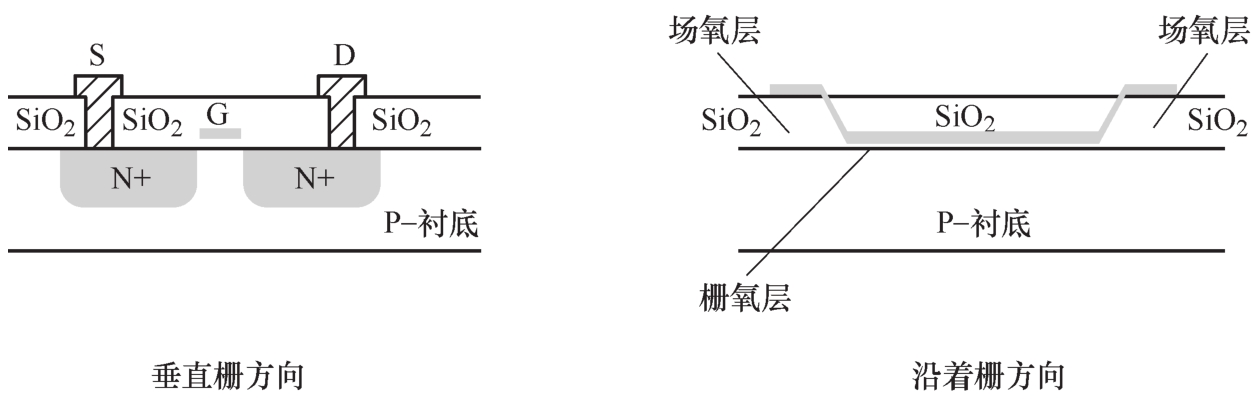如图2.10所示为NMOS管的剖面图,左图为垂直栅方向的剖面图,右图为沿着栅方向的剖面图。垂直栅方向的剖面图比较简单,与铝栅的结构非常相似,这里不再解释,而沿着栅方向的剖面图有些特殊的地方需要说明。从图中可以看出,栅的两端高中间低,低的部分下面是沟道,高的部分是栅超出扩散区的部分。低的部分氧化层比较薄,被称为栅氧层,高的部分氧化层比较厚,被称为场氧层。栅氧越薄越好,这样可以提高栅与沟道之间的电场强度,但是太薄了又容易击穿,通常情况下为几十到几百埃(Å)的量级(1Å=0.1nm)。在一些特殊的高电压大功率工艺中,比如BCD(Bipolar CMOS DMOS)工艺,栅氧层厚度可达几千埃。