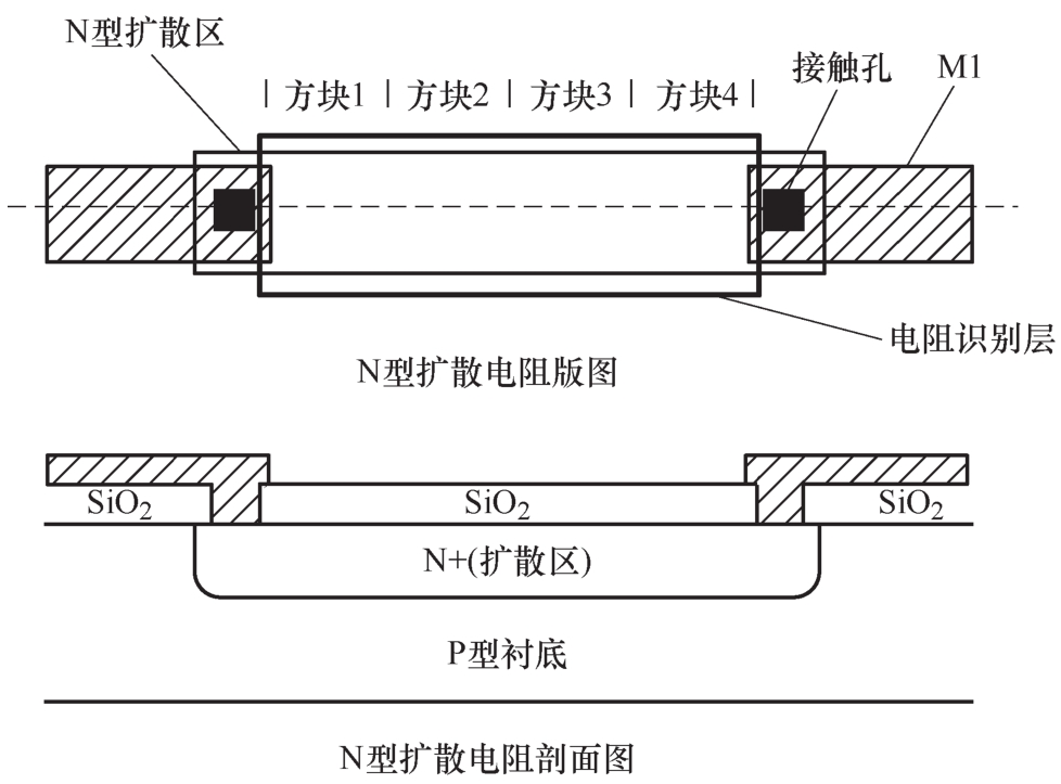 扩散区可以制作扩散电阻,其由长条形的扩散区构成,两端通过接触孔引出电极连接到金属,分为N型和P型两类。为了实现器件隔离,N型扩散电阻要制作在P型衬底上,P型扩散电阻要制作在N型衬底上。对于N阱CMOS工艺,N型扩散电阻可以直接制作在P型衬底上,而P型扩散电阻必须制作在N阱里,并且为了保证电阻与衬底之间的二极管隔离,要求P型衬底必须接地,N阱接电源。