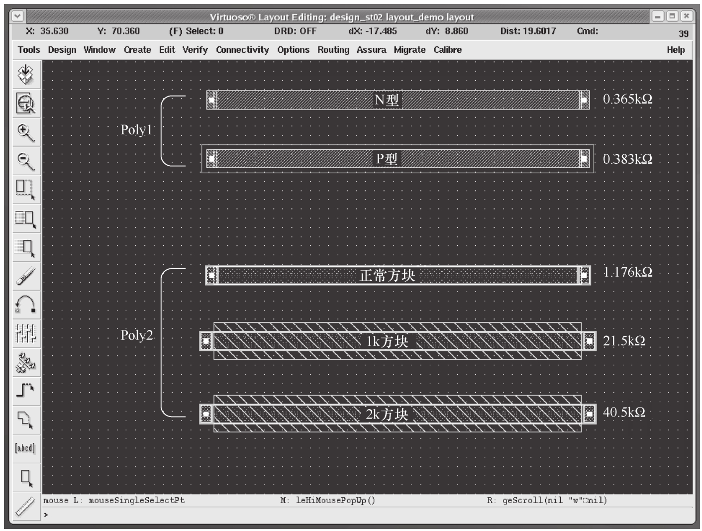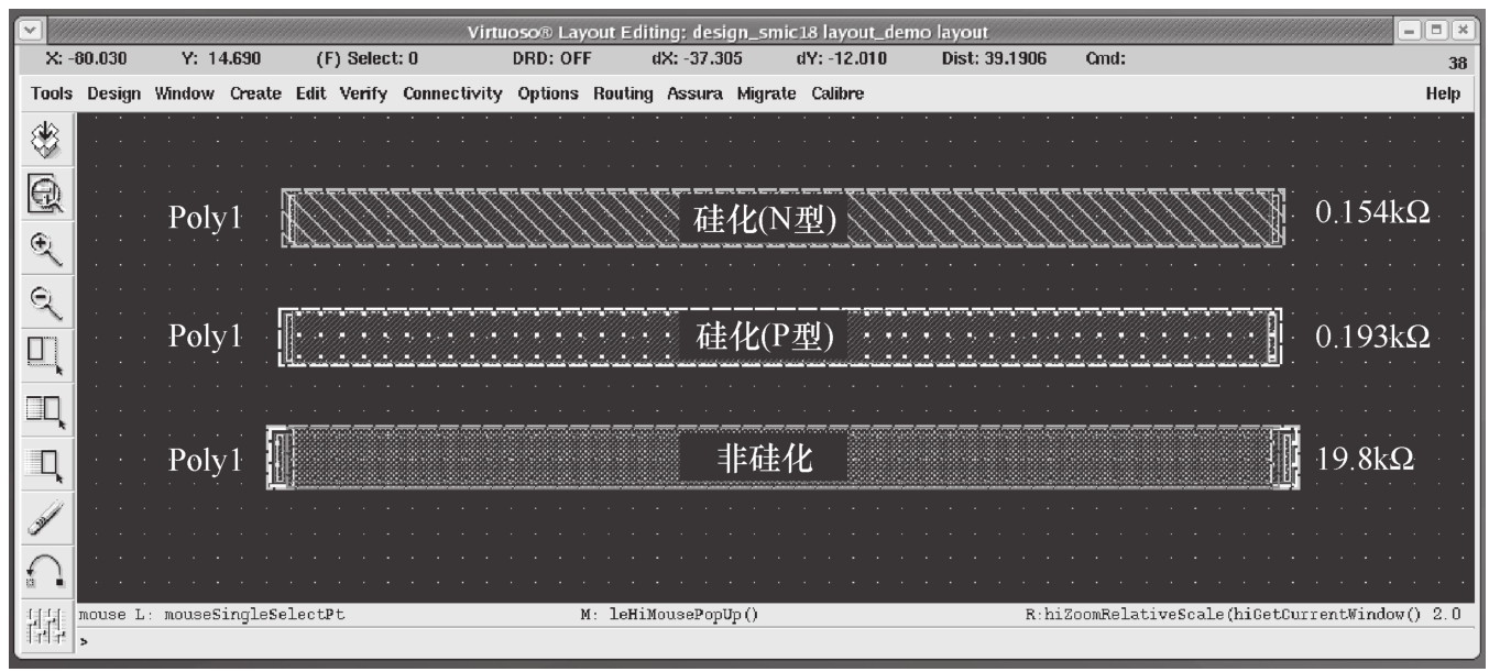 如图2.22所示,图中有3个Poly1电阻,它们都包括20个方块,上面两个是N型硅化和P型硅化的Poly1电阻,根据阻值可以算出N型硅化的Poly1电阻的 R □ 为7.5Ω,P型的为9.9Ω。下面的电阻是非硅化的Poly1电阻,其 R □ 比较大,接近1kΩ,是该工艺提供的唯一一种高阻值电阻,虽然在其图层中没有给出N型注入和P型注入的区分层,但是它一定是属于其中之一,且不能由用户制定。