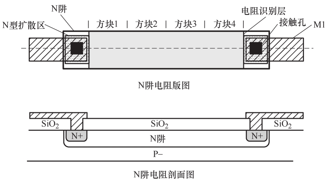 图2.16是N型扩散电阻版图和剖面图,由于N阱CMOS工艺已经将P型衬底接地,所以N型扩散电阻与衬底之间已经天然地形成了二极管隔离。图中长条形的N型扩散区是电阻的主体,两个接触孔打在长条形扩散区的两端用于连接金属。由于接触孔处的扩散区不属于电阻的识别区域,所以需要在版图中划出电阻识别层,EDA工具将根据电阻识别层内包含的方块个数和扩散区的 R □ 来计算总电阻值,本例中有4个方块。