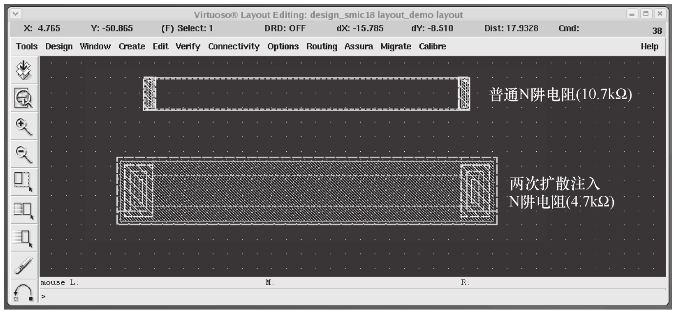 为了减小方块电阻,利用N+离子浓度大于P+离子浓度的特点,在N阱中进行N+和P+两次离子扩散注入,N+浓度超出的部分可以用于减小N阱的方块电阻,这样在不用特殊工艺步骤的情况下,就能有效地减小N阱的方块电阻。图2.19所示为N阱电阻版图,上面是普通N阱电阻,下面是进行了N+和P+两次离子注入的N阱电阻。两个电阻都是20个方块,其中普通N阱电阻的阻值是10.7kΩ,而进行N+和P+两次离子扩散注入的N阱电阻的阻值是4.7kΩ,方块电阻减小了一半以上。