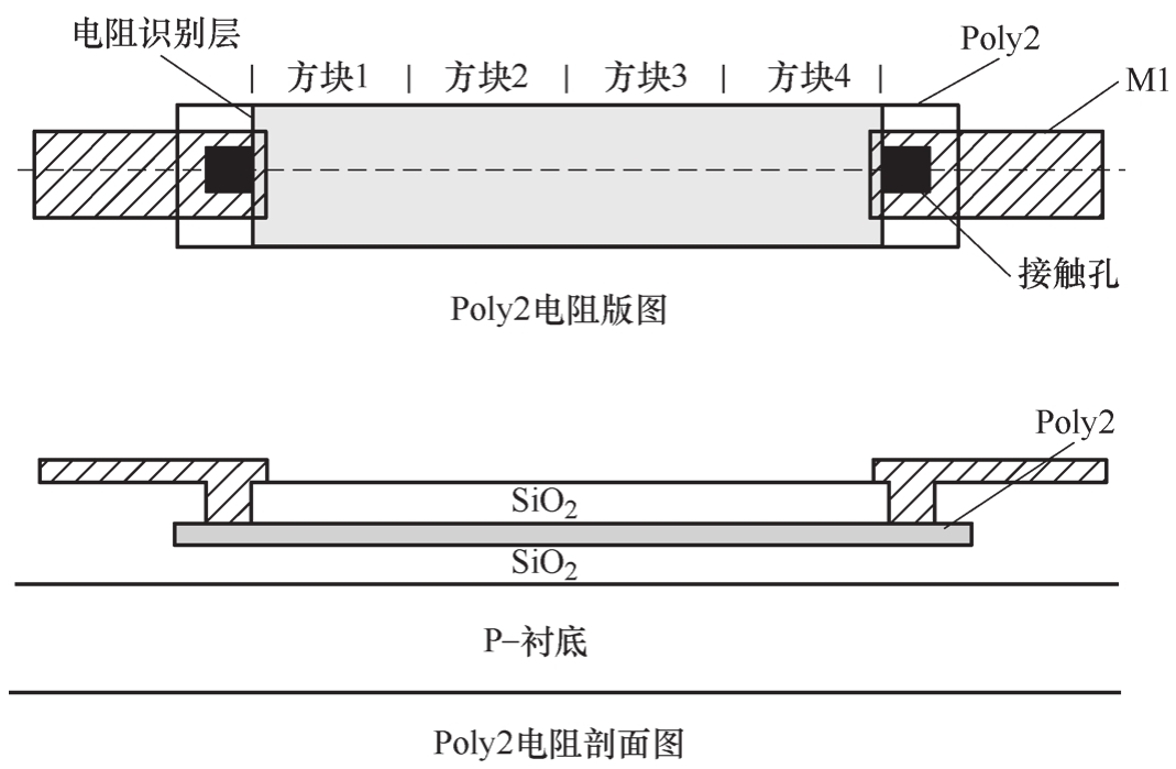 CMOS数模混合信号工艺通常有两层多晶硅,即Poly1和Poly2,它们都可以制作Poly电阻,其中Poly1主要用于制作MOS管的栅,但也可以制作电阻,在不额外增加工艺步骤的情况下,它的方块电阻较小且不可变,因此只适合制作小阻值电阻。Poly2主要用于制作电阻和电容,电阻的性能比扩散电阻和N阱电阻都好,是中低端混合信号工艺的首选电阻。