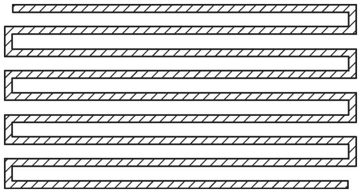 随着集成电路工艺的不断进步,金属线条越来越细,使得用细金属条制作电阻成为可能。在高端的集成电路工艺中,一般都会提供金属电阻。为了用更小的面积得到更大的电阻,金属电阻通常会做成如图2.23所示的形状。另外,虽然每层金属都可以制作电阻,但在几何尺寸相同的条件下,金属层越厚,制作的电阻阻值越小。顶层金属最厚,主要用于连接电源、地和制作电感,所以用它制作电阻时,面积效率最低。