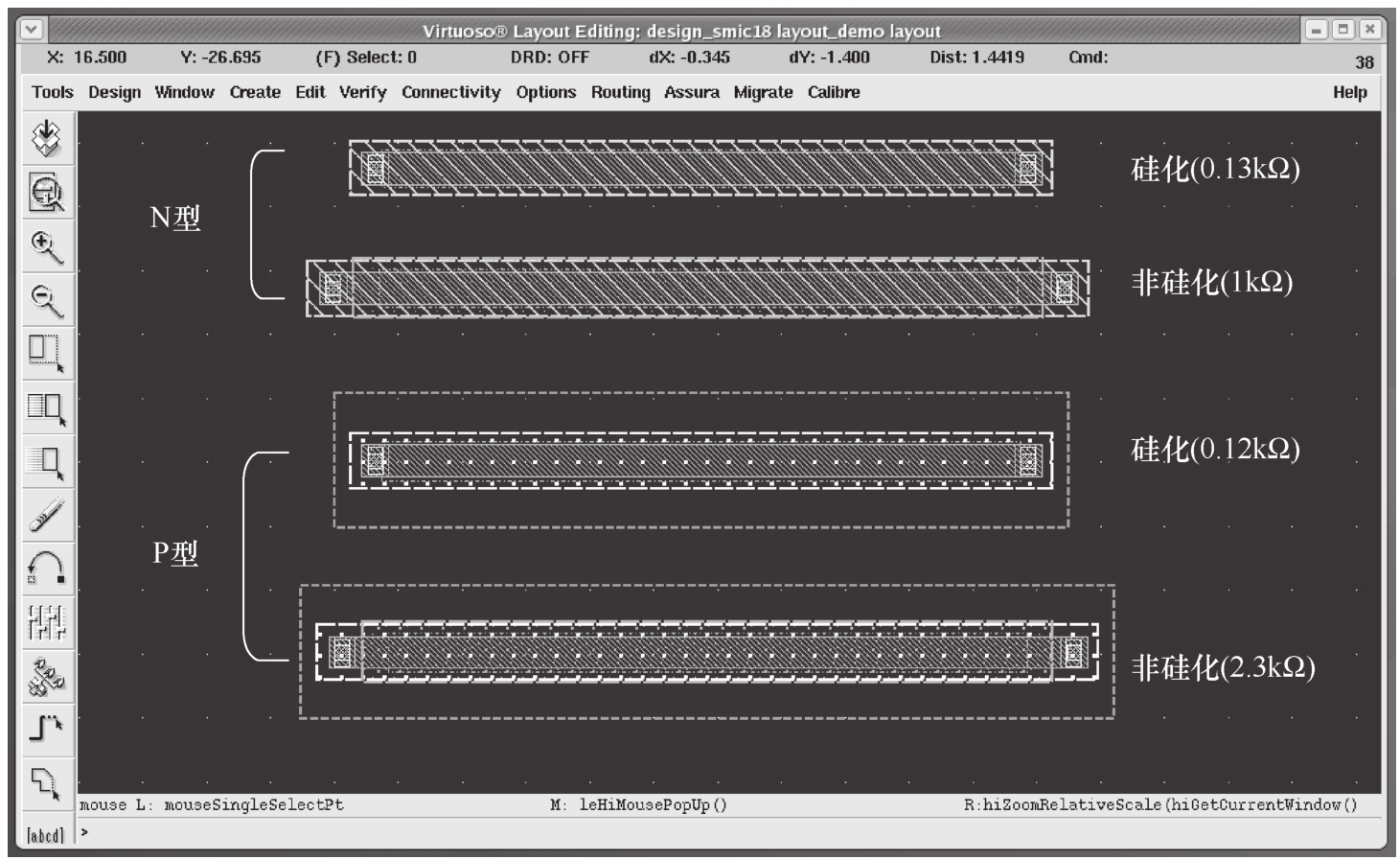 图2.17所示为扩散电阻版图,上边两个为N型扩散电阻,下边两个为P型扩散电阻。图中的电阻都是20个有效方块,每种电阻都分为硅化和非硅化两类,其中N型和P型硅化电阻的阻值较小,其方块电阻主要由硅化物决定,所以基本相同,其总阻值分别为130Ω和120Ω;而两个非硅化电阻的阻值都比较大,N型为1kΩ,P型为2.3kΩ,可见与硅化电阻相比,非硅化电阻是硅化电阻的10~20倍。