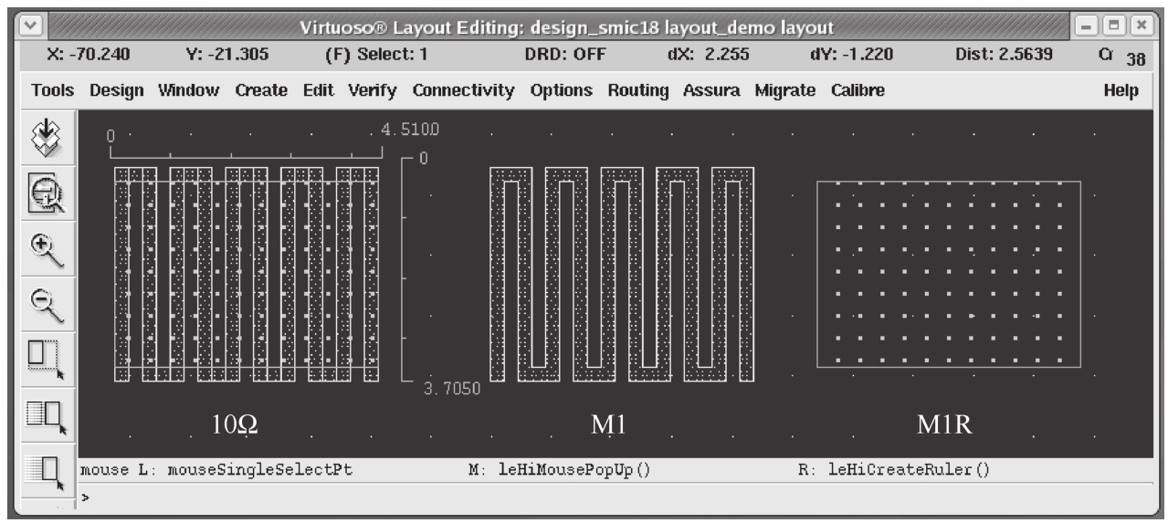 如图2.24所示为一个M1的金属电阻版图,金属线宽为230nm,阻值为10Ω,左侧为电阻版图,根据图中的尺寸可以看出,这个电阻大约占用(3.7×4.5)μm 2 的面积,中间和右侧为分解图,其中,中间为M1的线条,右侧为电阻识别层(M1R)。