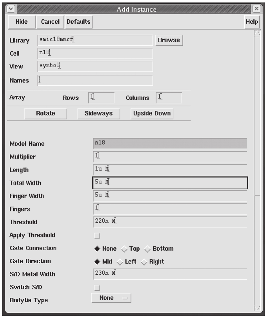 元件例化就是从目标工艺库中选择器件,并将其摆放到原理图窗口中的过程,本例的目标工艺库是smic18mmrf。放到原理图中的器件一般都是Pcell(参数化的器件),例化Pcell时需要填写它的主要参数。