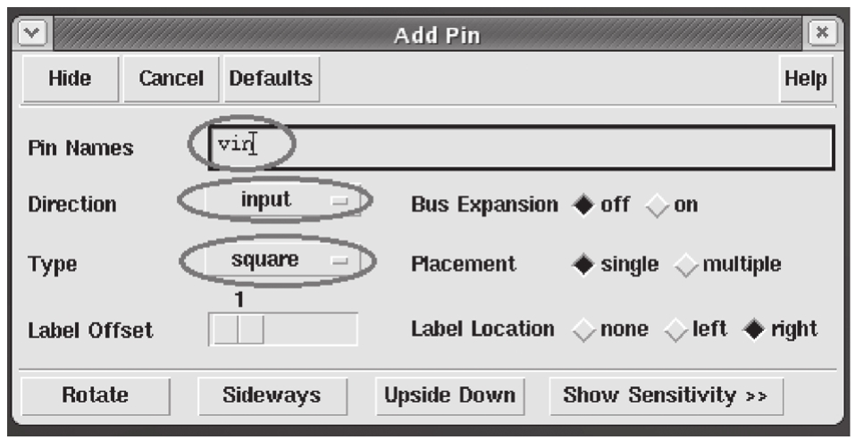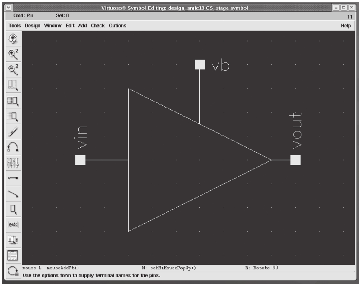 原理图与符号图的端口必须严格一致,端口的数量、名称、大小写和属性等都要相同,否则会报错。按P键弹出如图2.61所示的Add Pin对话框,在Pin Names栏输入vin,在Direction栏选择input,在Type栏选择square,单击Hide,放置前可以单击右键进行必要的旋转(617版取消了这个功能,需要到Edit窗口中进行旋转操作),将端口vin放置到符号图中。注意,端口一定要放置在格点上,端口名字不要超出符号图范围,否则会给将来的使用带来不便。用相同的操作放置输入端口vb和输出端口vout,注意vout的Direction是output,完成后的效果图如图2.62所示。
