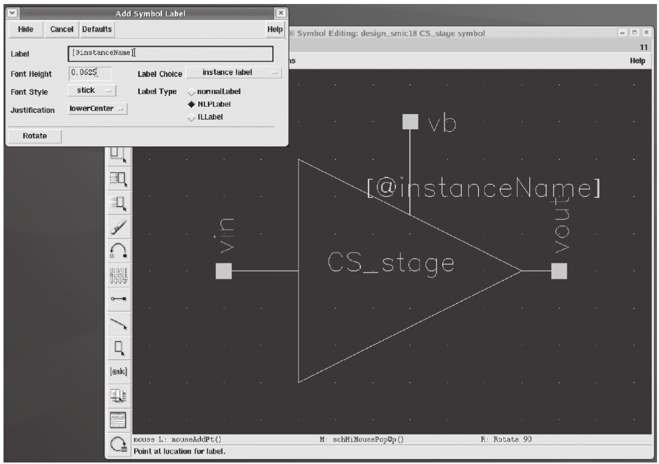 在符号图上放一些文字,例如模块名字和必要的提示或说明等,可以使符号图更实用,这就需要添加Label。放大器的符号图基本上都是一个三角形,为了在调用后能够区分出这是本例设计的放大器,可以在符号图上添加Label,例如写出CS_stage放在符号图上。另外还需要在符号图上放置一个默认的Label,即[@instanceName],有了这个默认的Label,在重复例化时就可以自动编号。