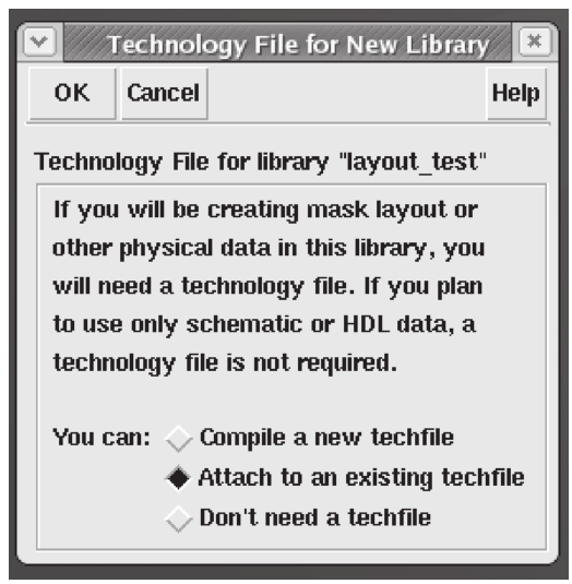 在弹出的Technology File for New Library对话框中,选择中间的Attach to an existing techfile选项,单击OK按钮,如图2.46所示。