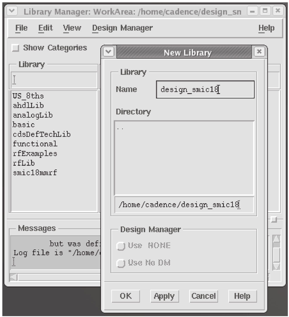 通过Cadence主菜单的Tools→Library Manager...打开Library Manager窗口,选择Library Manager菜单的File→New→Library...打开New Library对话框,输入库名字design_smic18后单击OK按钮,如图2.45所示。