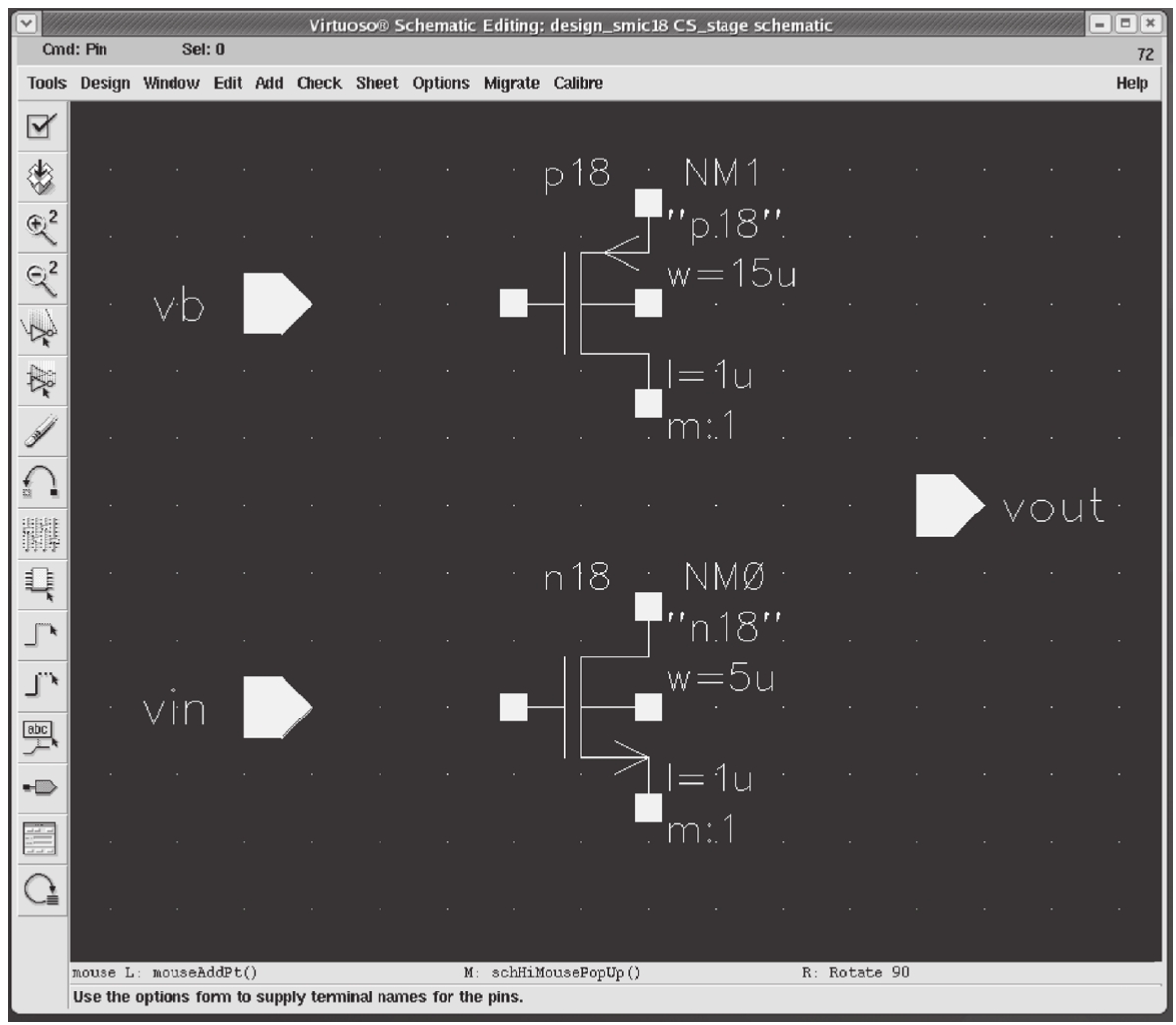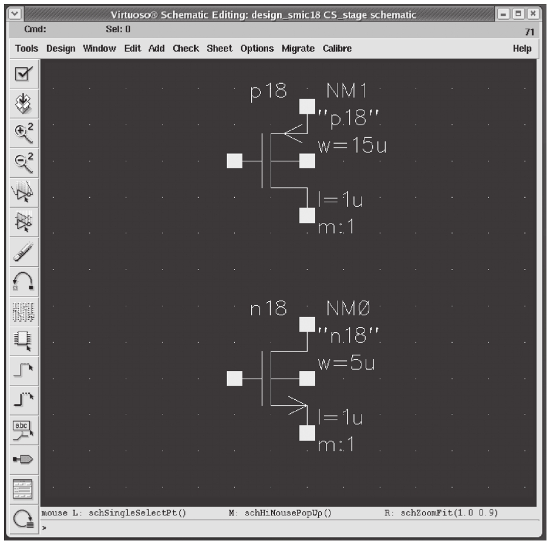 本例的原理图需要从smic18mmrf库中挑选n18(NMOS管)和p18(PMOS管),它们都是工作电压为1.8V的MOS管,将n18的宽长比设置为 W / L =5μ/1μ,p18的宽长比设置为 W / L =15μ/1μ,现在主要是为了学习设计流程和EDA工具的使用,所设置的宽长比可能不是最优的。