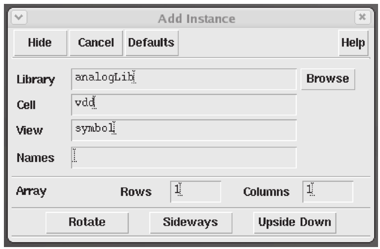 接下来放置电源和地,注意它们是全局端口。按I键弹出Add Instance对话框(见图2.55),单击Browse选择analogLib,之后勾选左上角的Show Categories,在Category栏中选择Sources的Globals,在Cell栏中选择vdd,在View栏中选择symbol,然后单击Hide,将vdd放在原理图中,用相同方法再放置gnd,完成后的总效果如图2.56所示。