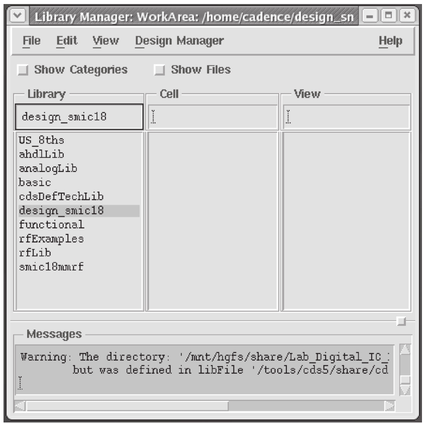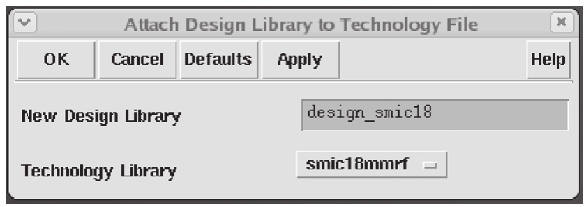 在弹出的Attach Design Library to Technology File对话框中,选择smic18mmrf,然后单击OK按钮,如图2.47所示。这样就建成一个关联了SMIC 0.18μm CMOS工艺的设计库,在Library Manager窗口中可以查看到它,此时这个库是空的,在Cell和View栏中都没有内容,如图2.48所示。