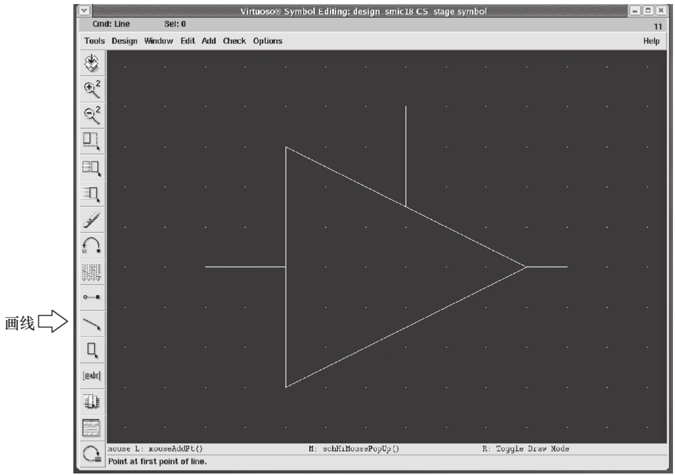 通常放大器的符号图是一个三角形,而直接用工具生成的都是矩形,所以这里最好用手工绘制符号图。如图2.60所示为画线后的效果图,单击图中箭头所指的画直线图标,可画出三角形和短线,如果不能画出斜线,则可以单击鼠标右键进行画线模式切换。端口线的外端要放置在格点上,将来这里要放置端口。注意,符号图要大小适中,三角形横纵方向以6个格点为宜,不可太大,否则与其他符号图放在一起时会显得十分巨大。