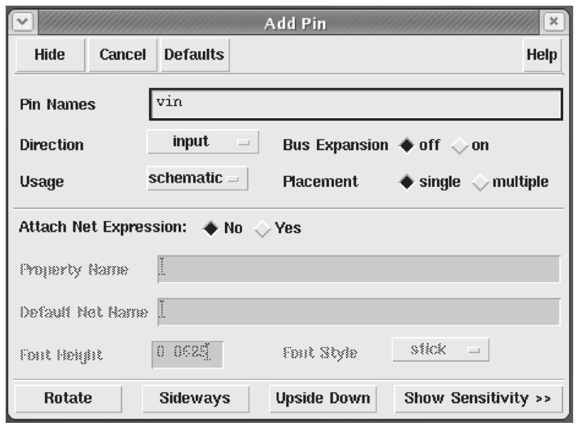 按P键弹出如图2.53所示的Add Pin对话框,在Pin Names栏中输入vin,Direction选择input,Attach Net Expression选择No,其他选项要与图中保持一致。然后单击Hide,端口vin就会随鼠标光标在原理图窗口中移动,单击鼠标左键即可放下。用同样方法再放置输入端口vb和输出端口vout,注意别忘了把vout的Direction设置为output,初学者经常会忘记设置Direction,最终结果如图2.54所示。