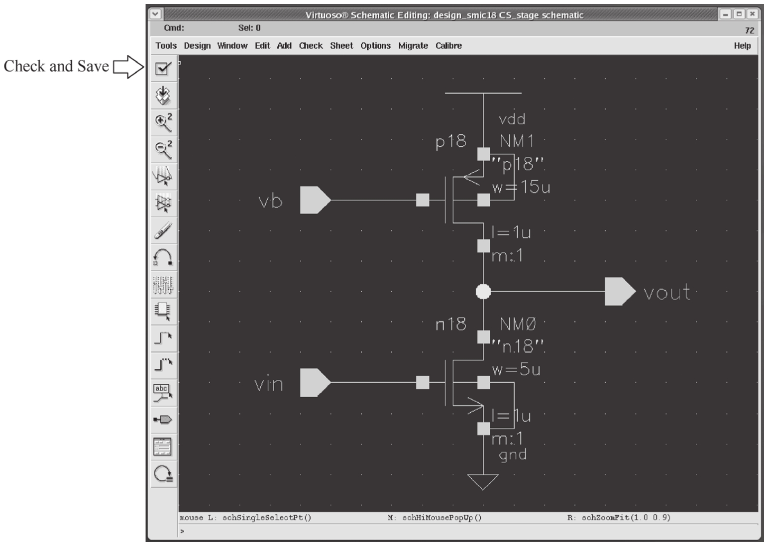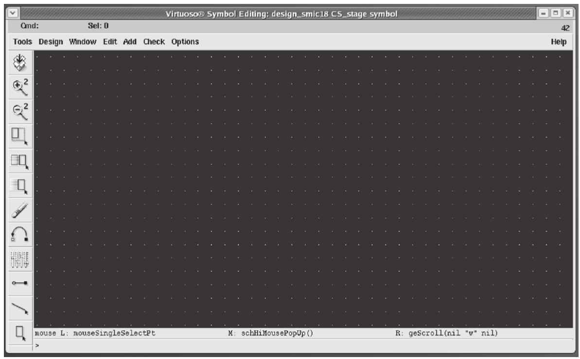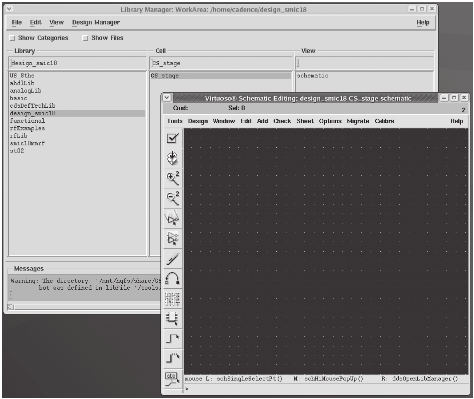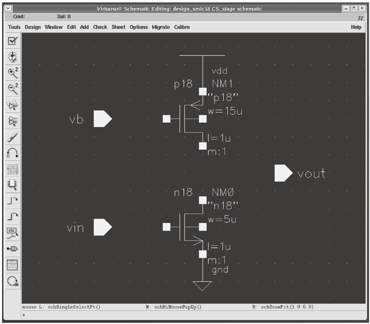 单击OK按钮后得到如图2.50所示的Virtuoso Schematic Editing窗口,原理图设计将在这个窗口中进行。另外,design_smic18库的Cell栏中增加了CS_stage,View栏中增加了schematic。