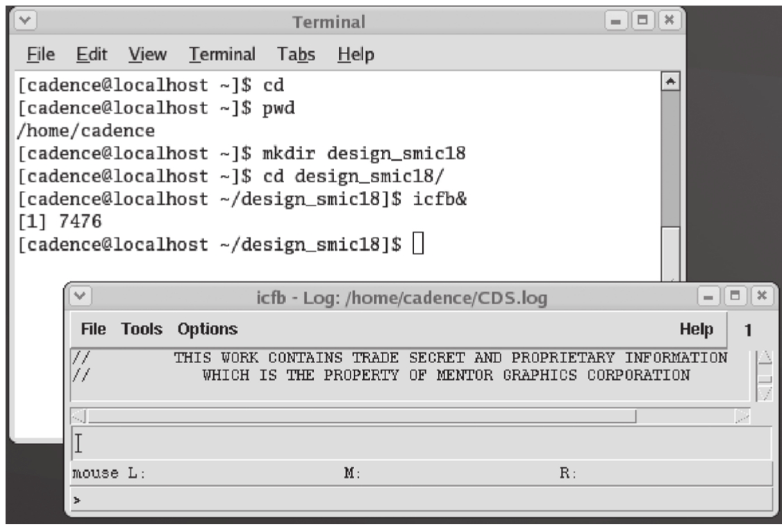 通过终端窗口输入命令,在自己的home目录下新建一个文件夹design_smic18,然后进入这个文件夹,输入命令icfb&来启动Cadence,或者输入virtuoso&来启动617版。图2.44所示为相应的shell命令和启动的Cadence主窗口(Command Interpreter Window,CIW)。