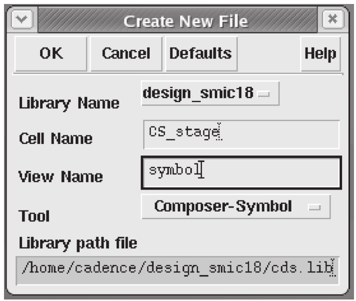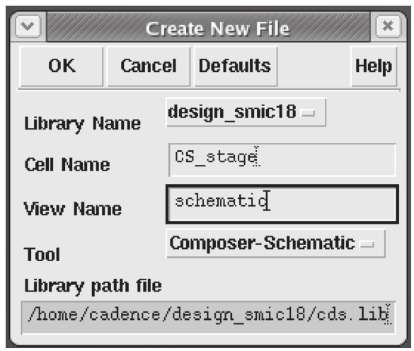 在Library Manager窗口选中design_smic18库,通过菜单File→New→Cell View...打开Create New File对话框,在Cell Name栏中输入CS_stage,即Common-Source Stage的缩写,然后在Tool栏中选择Composer-Schematic,此时View Name栏会自动变成schematic(不能手动输入),如图2.49所示,然后单击OK按钮。