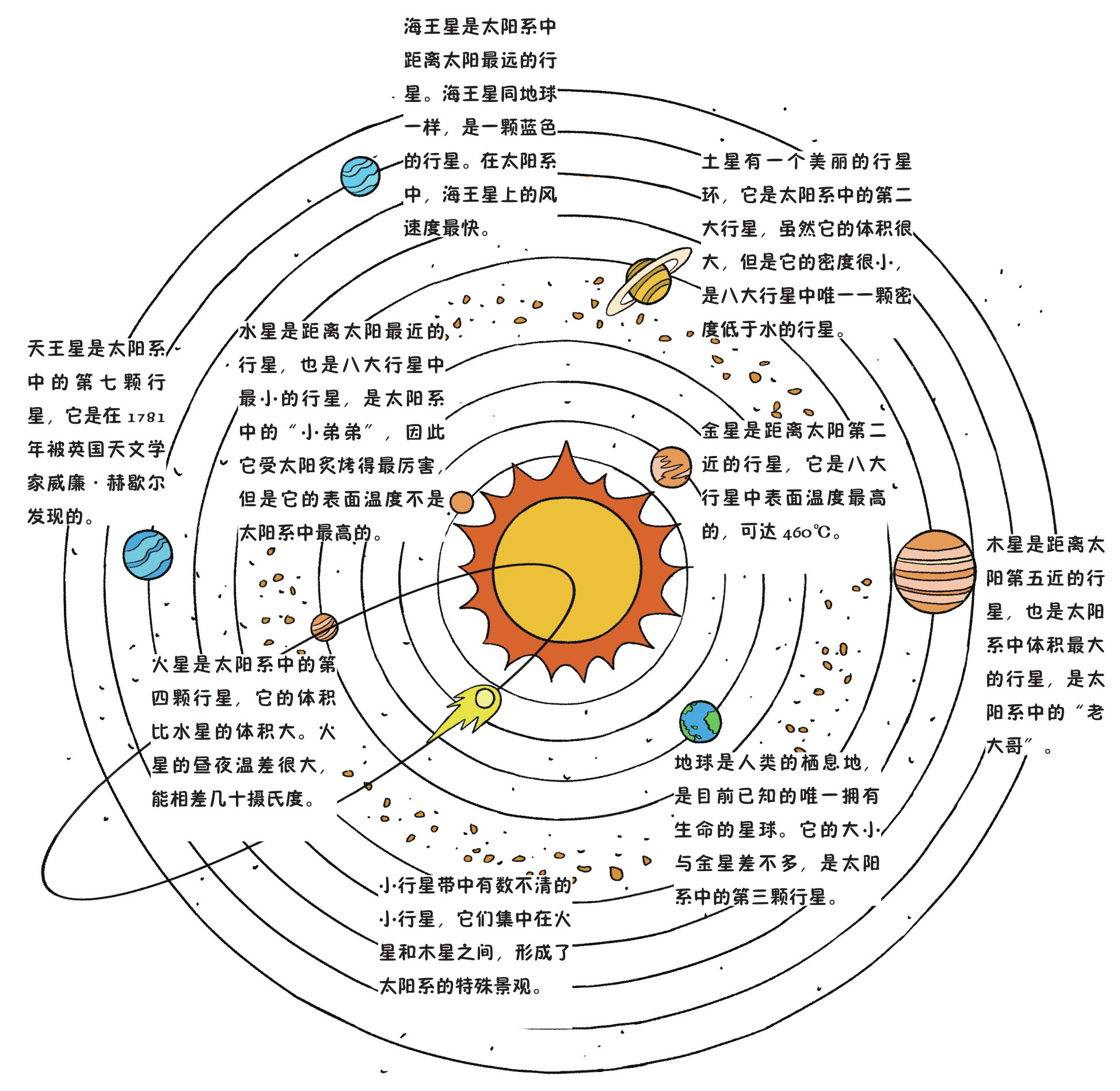顾名思义,太阳系是宇宙中以太阳为中心,受太阳引力影响的天体系统,其中包括八大行星、被观测到的上百颗天然卫星,以及数不清的小行星和彗星。