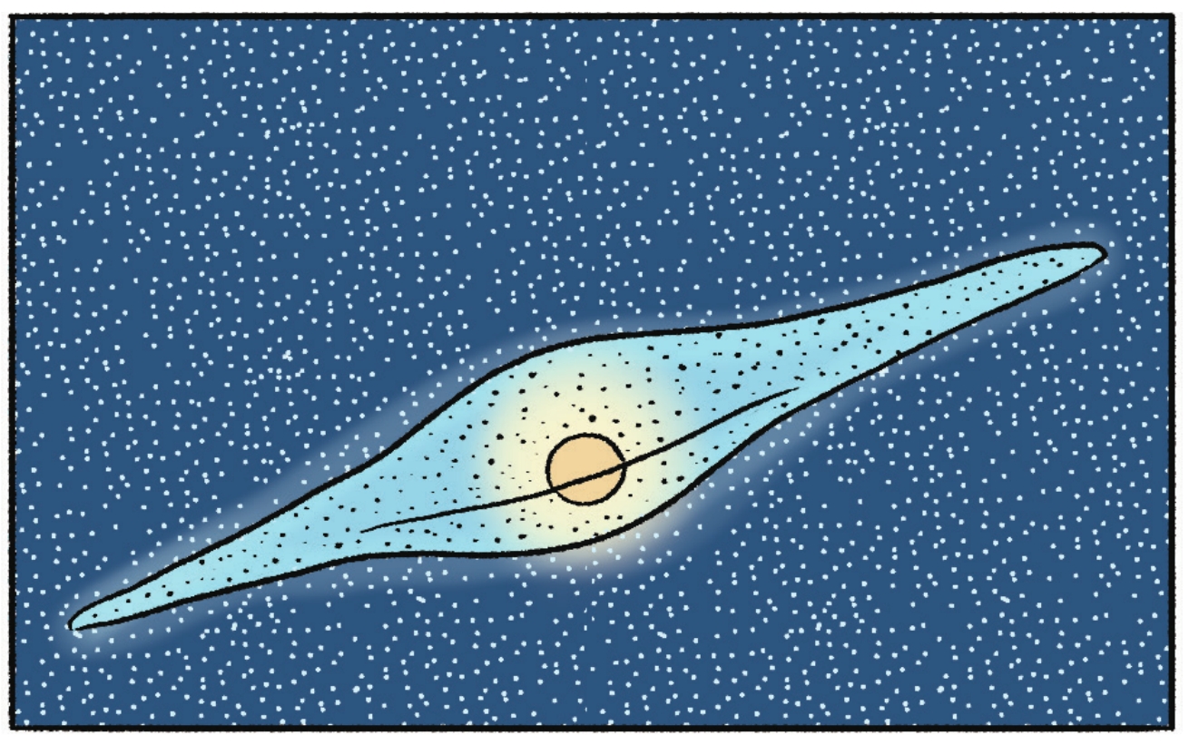 从侧面看,银河系就像一个盘子,它的中央凹凸有致,大部分恒星位于这里,周围四散着其他恒星和尘埃。