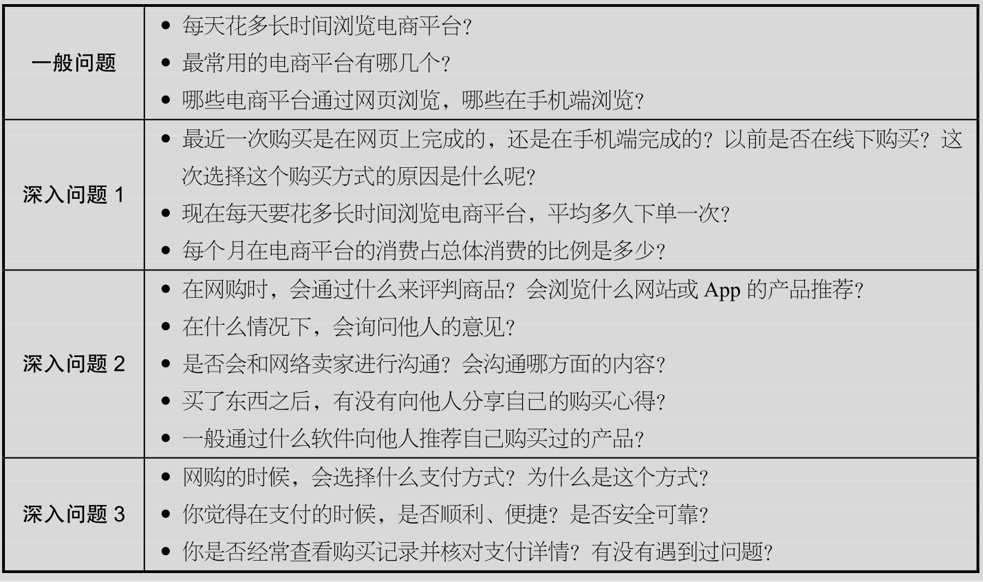 焦点小组的问题分为一般问题和深入问题。一般问题指询问用户使用产品的大致背景、习惯、方式等;深入问题会以一定的结构或层次来有针对性地根据具体的内容展开提问。在设计和执行焦点小组提问时,其结构和思路与 1.2 节中单人访谈法的内容本质上是一致的。但焦点小组在提问时,需要更加注意平衡每位被访者的发言时长,并融合多位被访者的观点,引导他们互相启发和讨论。相比于单人访谈法,焦点小组的主持经验需经过更多的操练和实战才能获得。