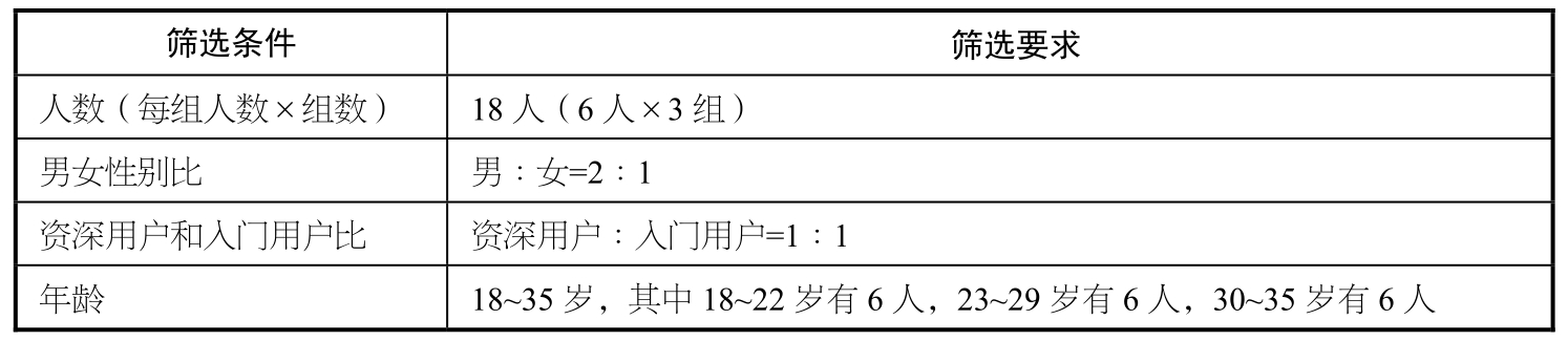 有了研究主题之后,就需要对招募的用户进行规划。我们把需要招募的不同类型用户的比例做成筛选的条件表,该表也被称为配额表。最常用的筛选条件包括性别、年龄、产品使用经验、职业、收入。配额表示例如表1-4所示。