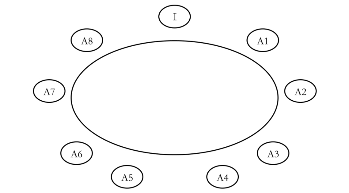 事先用A4纸打印好被访者的名字,折成可以立起来的桌牌放在每个人的座位前。主持人、助理研究员和观察员可以通过座位的顺序和名字进行更好的记忆和记录。焦点小组的主持人I、被访者A1~A8的座位摆放方式如图1-12所示。