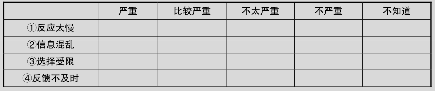 您觉得下列问题在我们产品的交互设计中是否严重(请在每一行符合您意见的空格中打勾)?
