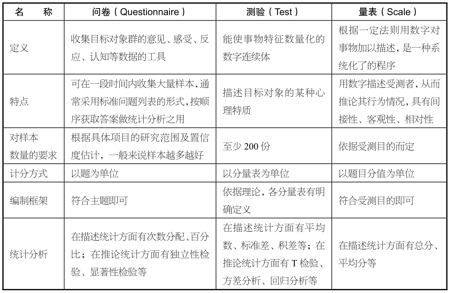 量表是标准化的测量工具,涉及信度和效度问题,编制要求严格,需要经过长期检验并得到广泛认可才可以被正式使用。因为量表编制规范,所以对量表收集到的数据的处理相对容易。另外,在编制量表的过程中,经常会用问卷收集数据,所以问卷是编制量表的辅助工具之一。问卷与量表的主要区别在于二者的严格程度、规范程度、标准化程度不同。