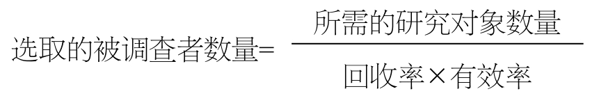 选取被调查者时常用抽样法,可随机抽样,也可分层抽样,视问卷的具体情况而定。选取的被调查者的数量通常应多于所需的研究对象,可以使用以下公式确定的被调查者数量。