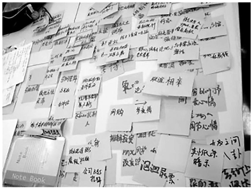 卡片式智力激励法又称CBS法,由日本创造开发研究所所长高桥诚发明,其特点是每人都可以对其他人提出的设想进行质询和评价。针对所要讨论的主题,让每个与会者在卡片上写出若干想法、点子,然后向其他人介绍。其他与会者可以在倾听、赞扬的同时,对原始的想法进行再创造,继续在同一张卡片上写出想法、点子,从而尽可能多地收集想法、创意。卡片式智力激励法的卡片展示如图1-15所示。