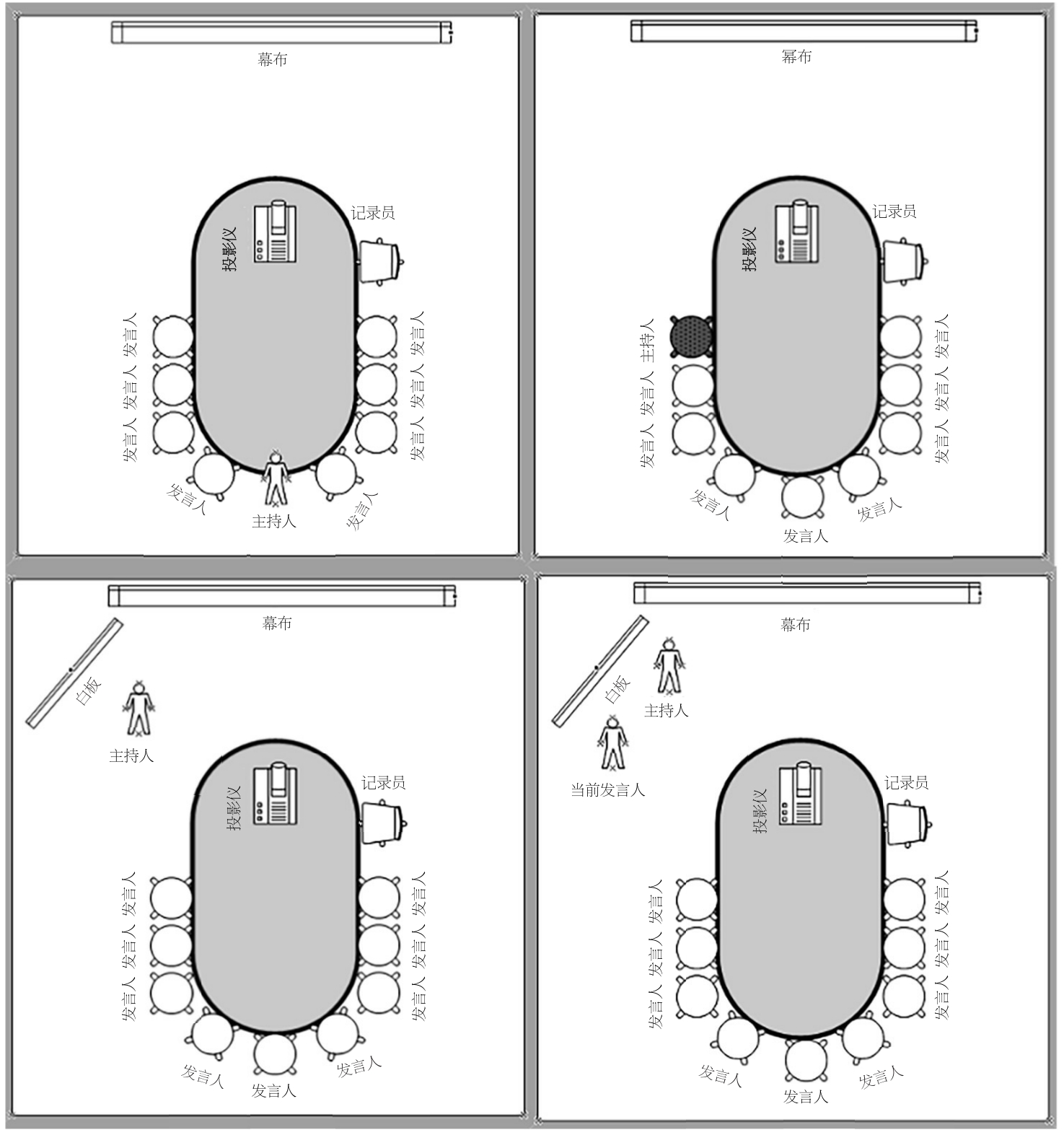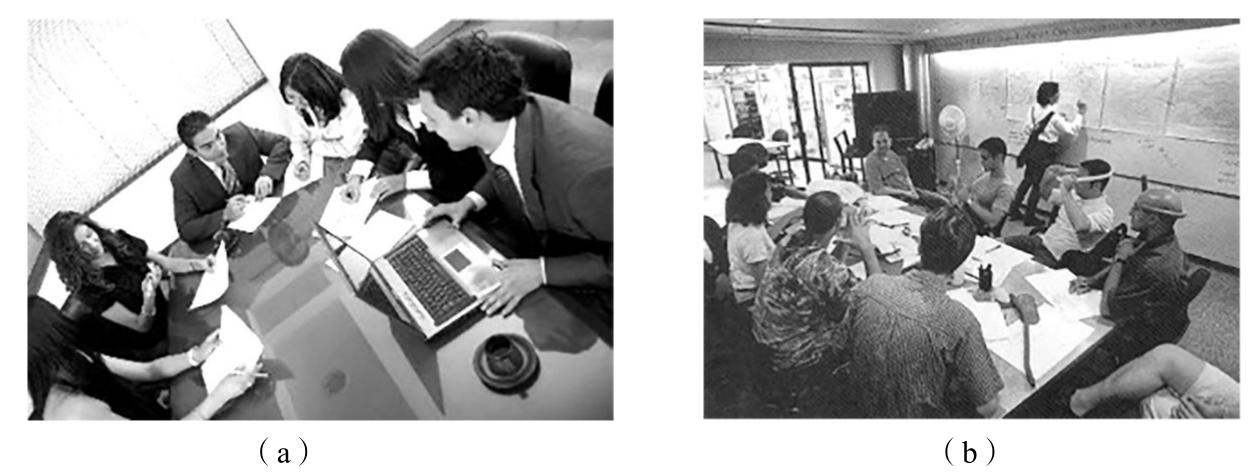 (6)布置会场:应尽量选择较为安静、有桌子的会议室作为会场,以保证与会者能充分发表各自的看法,助理研究员能完整记录每个想法。头脑风暴的会场环境如图1-16所示。