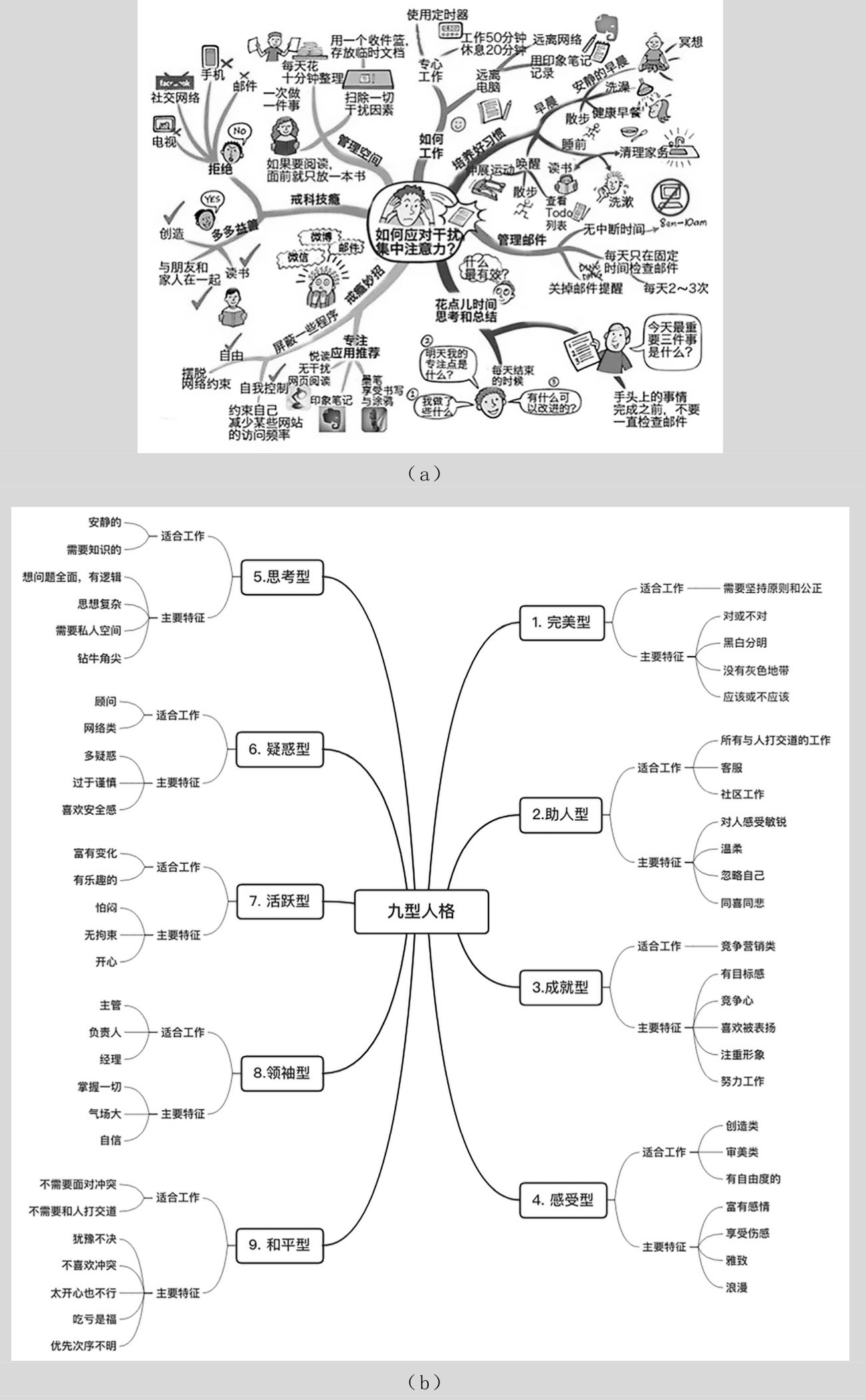 思维导图 [22] ,也称心智图、脑图,是一种结合了图画和文字的优势,能反映主题层级性、关联性和隶属关系,并能快速、有效地表达发散型思维的可视化工具。思维导图有助于记录思维过程,并能起到启发和组织思维的作用。因此,思维导图是支持头脑风暴活动的良好工具。思维导图的呈现形式没有统一标准和要求,既可以只以文字的形式出现,也可以以图文配合的形式出现(图1-17)。因此,与会者可根据具体情况,灵活选择纸笔或软件等来完成思维导图。常用的思维导图软件有MindManager、MindMapper、XMind、FreeMind等。思维导图软件可以使用结构化的表现方式,打破Word等文字处理软件的线性文字结构;也可以使用图形化的视觉表达,随时插入有意义的图标,生动表意;还可以使用鼠标等工具进行拖拽操作,方便随时修改;还可以在在线头脑风暴中使用,让与会者自主输入内容,实时同步,提高在线沟通效率。