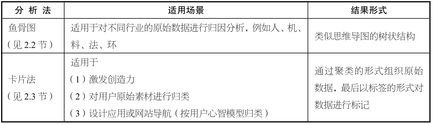 表0-4 侧重用户场景的定性数据分析法的适用场景和结果形式