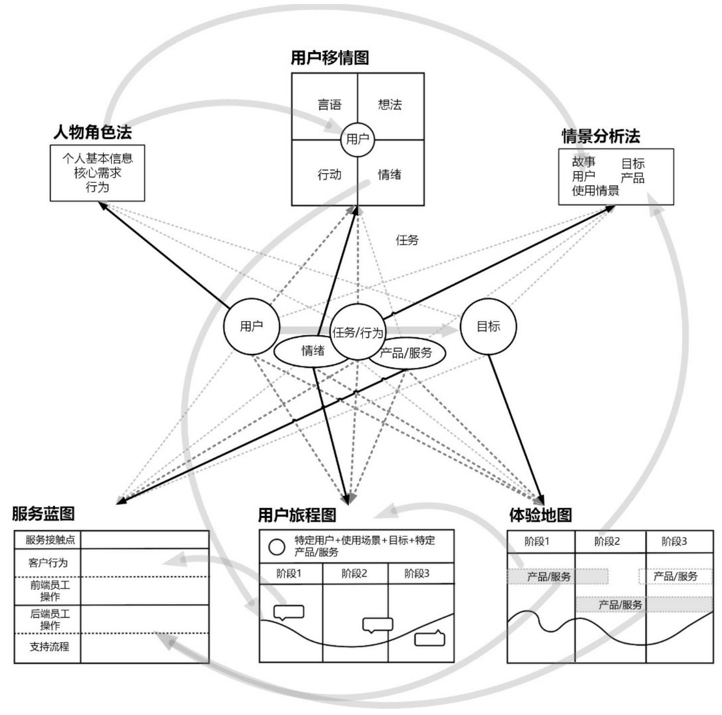 侧重用户场景的定性数据分析法,包括情景分析法、人物角色法(Persona)、故事板、体验地图(UX Mapping)、用户移情图(Empathy Maps)、用户旅程图(Customer Journey Mapping)和服务蓝图(Service Blueprinting)。