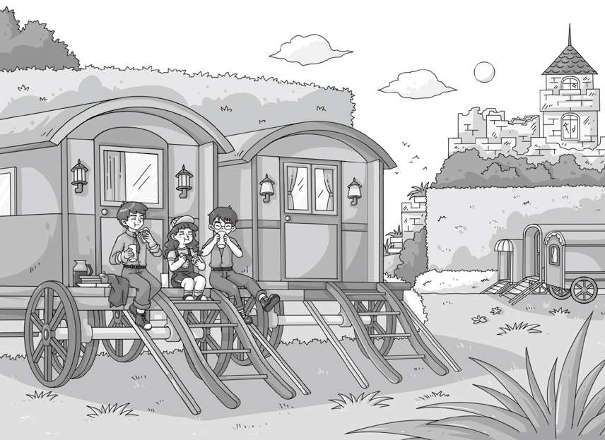 不远处,还有三辆大篷车,但都是现代化的大篷车。住在里面的人还没有起床,门关得紧紧的。这三个孩子还没有机会和他们交朋友。