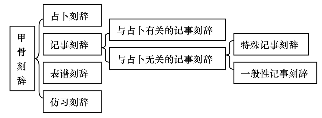 《甲骨学一百年》指出,甲骨刻辞主要包括占卜刻辞;记事刻辞;表谱刻辞;仿习刻辞。 [1]
