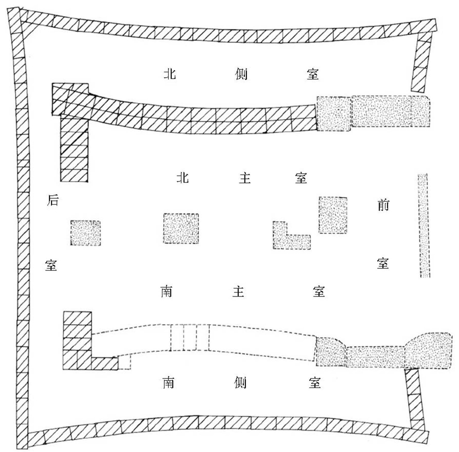 (4)唐河县石灰窑村汉代画像石墓墓室结构(图3-7)。该墓位于唐河县黑龙镇公社石灰窑村,墓室方向213°,北距唐河县县城26千米。墓室南北长3.97米、东西宽3.34米、高1.50米。室内中间有一道隔墙,把墓室分成东、西两部分。隔墙靠南端有一门洞,东西相通。东室墓门有门相、门柱、门扉和顶门石。门扉有门枢,门楣有臼窝。西室墓门仅用两块石板封堵,外用一石条支顶。两室的后部都呈不规则的弧形。西室后部留有生土二层台,台上满置器物,东室未留立层台。墓壁和隔墙的绝大部分都使用碎毛石片砌垒。墓底和墓室后部未经砌筑。该墓全部用石材构筑。 [53]