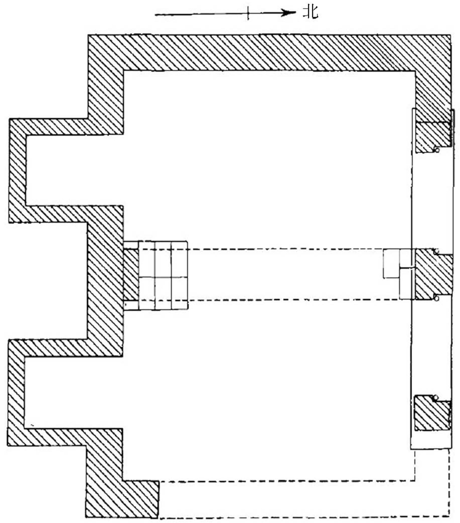 (5)唐河汉郁平大尹冯君孺久画像石墓墓室结构(图3-8)。该墓位于唐河县湖阳镇新店村。墓室方向方向95°,墓室东西长9.5米、南北宽6.15米。墓室建筑分前室、中室和后室三个部分。前室从前大门到中大门,包括前室和南、北两个车库,这一部分除各门的门框、门相和门扉是石质外,其余皆为砖结构。中室从中大门到后主室,为一近似正方形的“天井”式“院落”建筑,除顶部用砖叠券为覆斗式之外,其余均为石结构。后室包括南、北主室,南、北、西“阁室”,为石结构。墓由大门、前室、南车库、北库房、中大门、中室、南主室、北主室、南阁室、北阁室、西阁室11个单位组成。墓门共八道,除南、北车库门和中大门上有门框、门相而无门扉外,其他如墓大门、南北主室门、南北阁室门均有门框、门相和门扉。墓室的后部,围绕南北主室的南、北、西三面,有三个阁室,三阁室相通,形成对称的回廊式建筑。墓大门由南、北两门侧柱、一门相、一门槛和两扇门扉组成。门高1.42米,宽1.40米。前室平面东西呈长方形,长2.90米、宽1.76米、高2.30米。南车库由库门和库室组成,门高96厘米、宽114厘米。北库房平面呈长方形,建筑形式和南车库同。门高98厘米、宽104厘米。中大门位于前室与中室之间,有门相、两侧柱和门槛,无门扉。门高1.34米、宽1.28米。中室南北长2.5米、东西宽2.03米。南、北两面门与阁室相通。主室东西长3米、南北宽2.56米、高1.24米。南阁室阁室东西长5.90米、南北宽1.10米、高1.34米。西阁室也可称墓后室,南北长3.20米、东西宽0.98米、高1.34米。北阁室有阁门和阁室,东西长5.90米、南北宽1.10米、高1.34米。冯君孺久墓是介于纯石和砖石混作墓之间的一种较特殊的墓葬形制,但结构更为复杂。该墓在前室之前又增设了一甬道和左右两耳室(车库),结构为砖石混作,除了前室、甬道及南北耳室以砖砌筑和券顶外,其他各室仍用条石盖顶,以石板砌墙体,类似纯石墓构造,呈现出由纯石墓向砖石混作墓过渡的特征。墓顶除了使用早期常见的石条平顶和砖券拱顶外,还出现了一种新的墓顶形式——砖券穹窿顶。该墓的年代属于新莽时期。 [54]