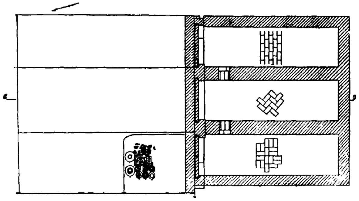 (3)唐河县湖阳镇汉代画像石墓墓室结构(图3-6)。该墓位于唐河县湖阳镇西北二里许,墓南北长5.54米、东西宽5.98米、高2.78米,墓室由三个并列的券洞构成。中室前部有通向东、西两室的过道。东过道高0.66米、宽0.4米。西过道高0.64米、宽0.4米。三室大小基本相同,长4.76—4.8米、宽1.42米、高2.06—2.09米。墓门由三个门楣、四个门柱、六个门扉和槛石构成。此外,墓室中的东室,发现大量棺灰中夹杂着金箔和漆皮,同时还发现了鎏金凤凰和鎏金铜印章,说明了墓主人应该有一定的级别。该墓年代属于西汉中后期。 [52]