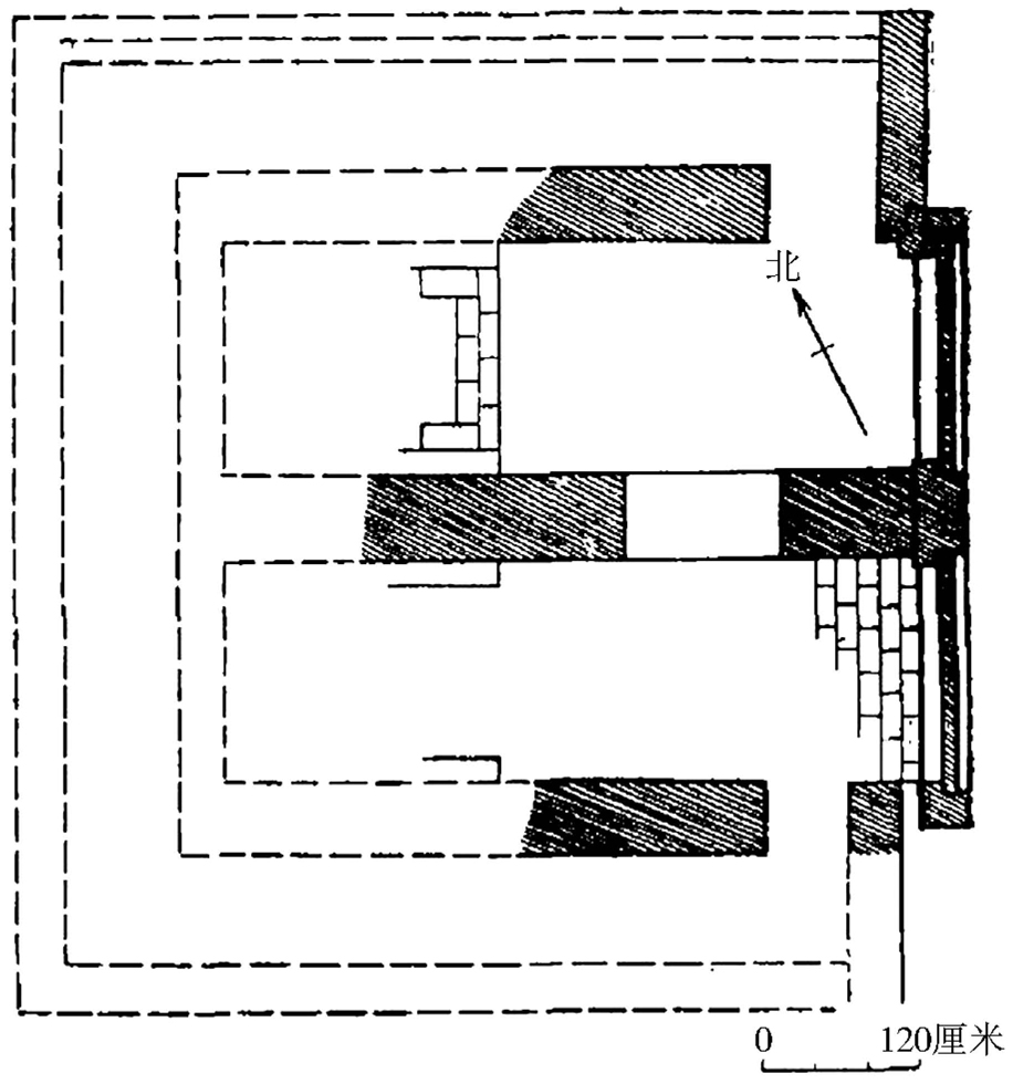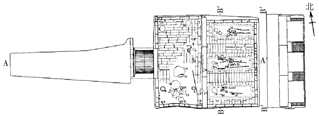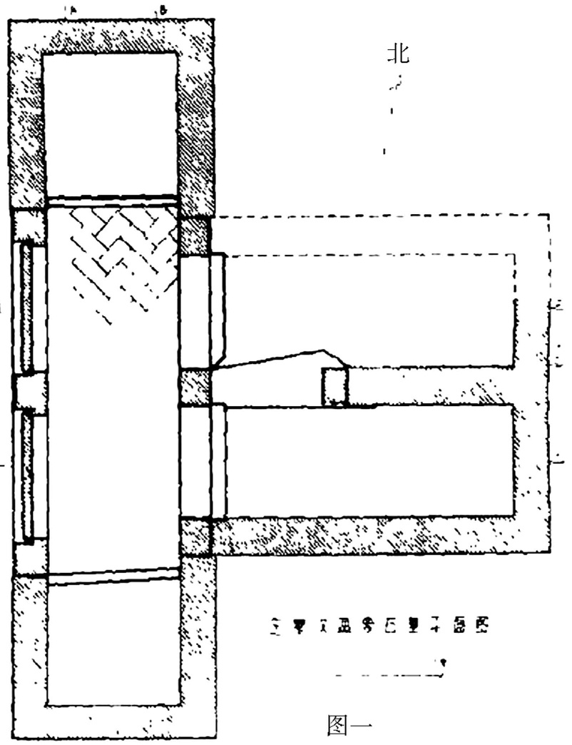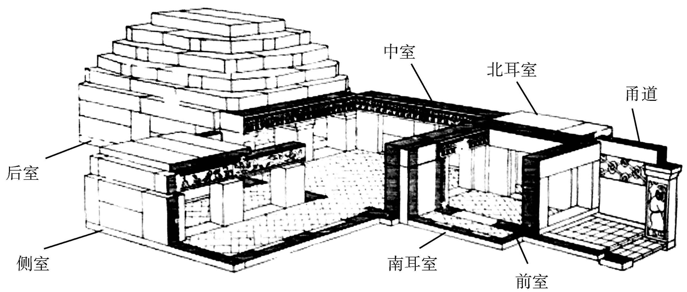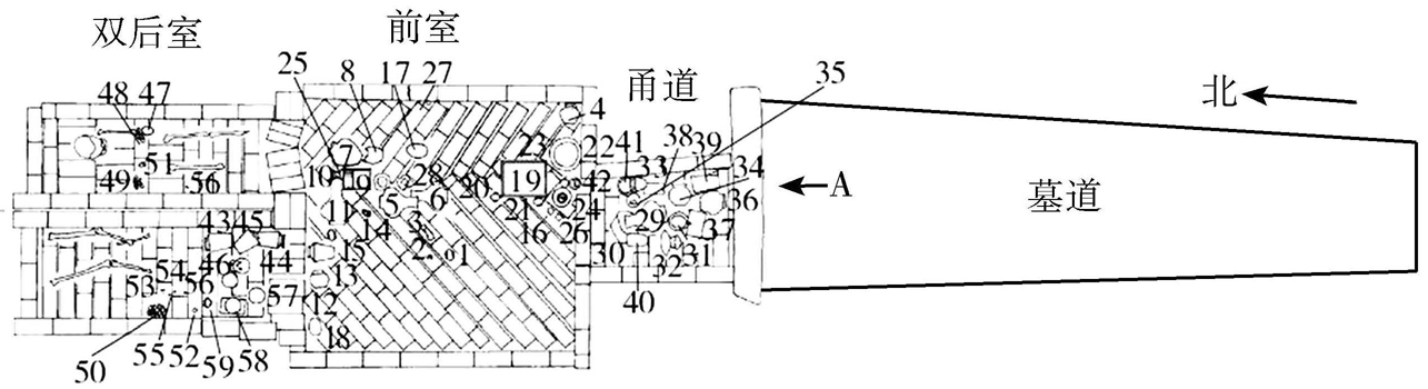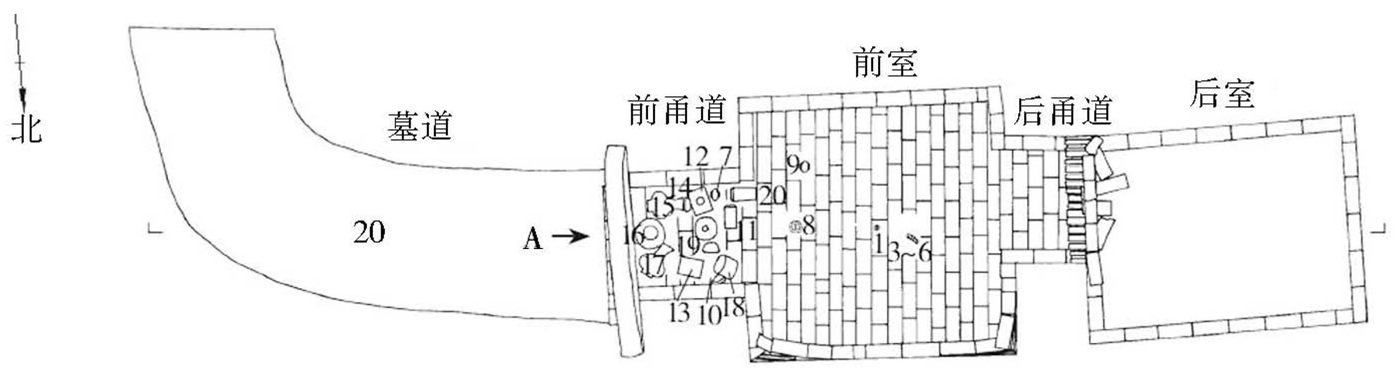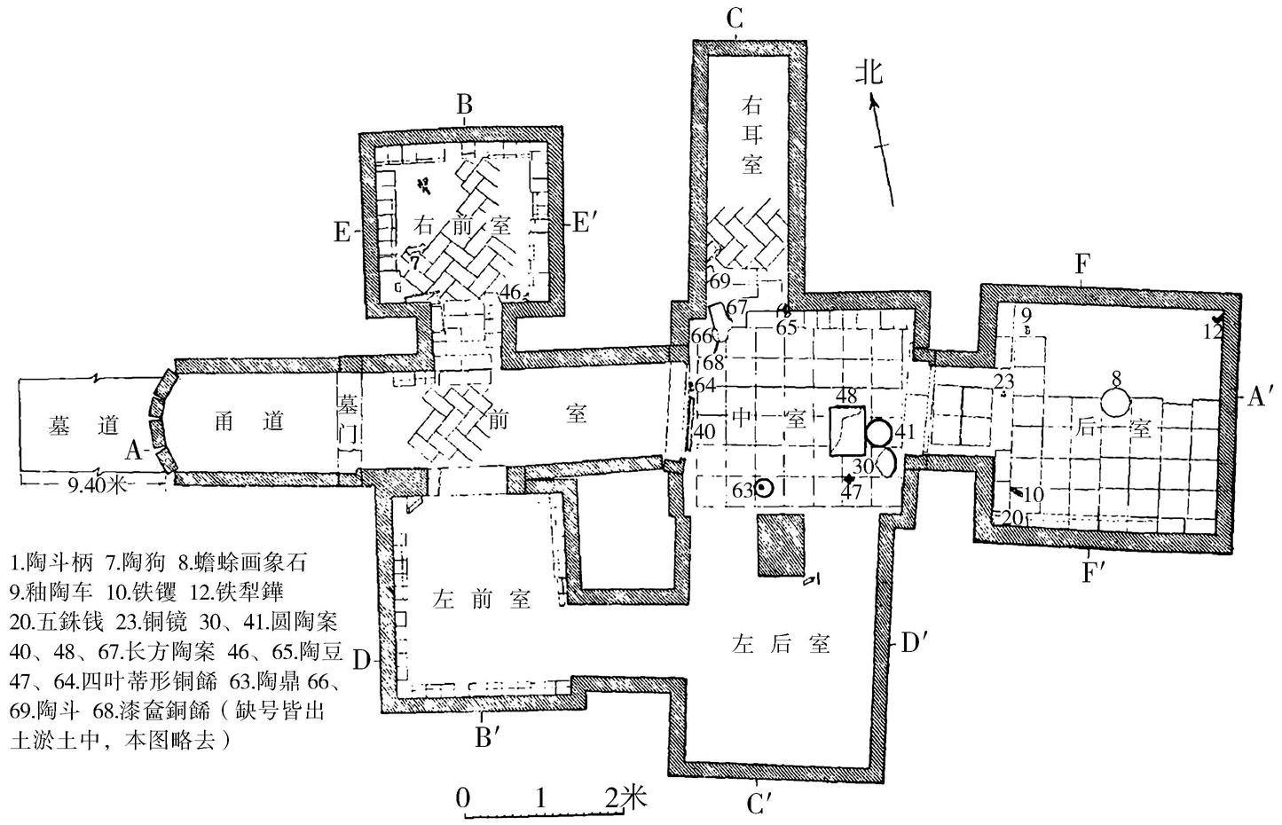 痕。土塚中央偏西的地方,发现一处盗洞,直径约1米。洞内填土松虚而较黄,其中遗留有少量夹纻漆器残片和汉代陶片。这个盗洞破坏了中室穹窿顶的北部,盗者从此进入墓内,将各室扰乱,墓内的随葬品遭到损失。墓道:为斜坡式,位于墓门和甬道之西,长9.4米、宽1.12米。它的西端距地表深2.4米,东端深0.9米。甬道:墓道与墓门之间,设有砖砌甬道,长2.04米、宽1.28米、残高0.82米。南北两壁以II式花纹砖(各式花纹砖或素面砖详后)平铺顺砌。砖长37厘米、宽17厘米、厚7.5厘米。铺地砖已被破坏。在墓道与甬道相接处,尚可见到一层封门砖,是利用三块半砖逐层平铺垒砌、封堵于甬道口。残存的一层封门砖平面排列呈弧形。砖长42厘米、宽17厘米、厚7厘米。墓门:位于前室之西,高1.45米、宽1.25米。门楣是由石1、门柱石2和门槛石1构成。门楣石长1.8米、宽0.23米、厚0.42米,正面刻画像一幅,向下的前侧棱处,刻一道门框槽。框槽的左右两端各刻一门枢窝,窝径10厘米、深0.45厘米。左右两门柱石表面粗糙,皆作方柱形,高约1.48米、厚0.24米,宽度则因下粗上细不等,右柱宽10—14厘米、左柱宽16—19厘米。门槛石的两端皆埋于土圹内,可知的长度为1.6米、宽0.29米、厚0.18米,已断成两截。发掘时已不见两扇石门。墓室:系砖石混合桔构,长11.6米,最宽处9.22米,由7个墓室构成。它的平面布局是:前室、中室和后室建筑在同一条中轴线上,皆设有石门可通。前室之北设一券门通往右前室;前室之南垒砌石门通往左前室。左前室之东砌有左后室,中间亦有券门可通。中室之北券砌右耳室;中室之南砌券门二以通左后室。前室:平面呈长方形,长3.87米、宽1.14米、高2.02米。南北两壁以小花纹砖平铺顺砌九层,然后发券,以“交错拜列券法”将室顶砌成弧券顶。南北两壁至室顶所砌花纹小砖的花纹是完全对称的,今举北壁为例,说明各层花纹砖的式样:最下砌XIX式小砖一层,其上依次砌V式砖一层、XIX式砖二层、V式砖一层(此层兼砌以素面小砖)、素面砖七层、V式砖八层(偶有将带花纹的砖侧砌向壁内的)、III式砖二层、V式砖一层、III式砖五层、V式砖一层、III式砖一层、III式与VI式砖混合券砌五层,券顶中央为III式和V式砖交错券砌。上述VI式花纹砖上印有“大吉”两字,砌时皆两两相对地砌入券顶上。或者每两块VI式砖间砌以一III式砖。铺地砖仅残存一部分,排列呈人字形,砖长40厘米、宽17厘米、厚8厘米。中室:位于前室之东,平面呈方形,东西长2.78米、宽2.44米、残高2.38米。西壁与前室相接处没有石门,门高1.32米、宽1.24米。门楣石已断为两截,残长约2.4米、宽0.28米、厚0.4米。石的正面和背面各刻画像一幅,向下一面前棱处,也刻出直角的门框槽,两端也各刻门枢窝一个。此石出土时,长的一段已倒塌于右耳室门外的淤土中,短的一段倒置于通往左后室的西券门之外。左右两门柱石形制与墓门的相似,高皆约1.32米,厚约0.26米;左柱最宽处0.2米,右柱最宽处0.24米。门槛石外露的长1.24米、宽0.26米、厚0.18米。此门在发掘时亦未发现有石门。中室北壁以XIX式小砖交错顺砌,现残存17层。在靠近西北隅的地方以XIX式及XXI万式小砖砌成双弧券门,即为右耳室门,门高1.06米,最宽处1.02米。券门顶上尚承托残存的中室穹窿顶砖18层,其砌法以XII式、XIII式、XI式、XII式、XIV式、XVII式、XVIII式小花纹砖逐层叠涩垒砌,但每向上垒砌一层其圆周半径皆缩小4—6厘米。中室南壁券砌两个并列的券门以通往左后室。由于室顶和券门塌毁,残高0.6—0.9米。南侧门宽0.84米,北侧门宽约0.96米。两门皆系双弧券。两门间所夹的砖柱亦以IX式小砖垒砌,东西长0.58米、南北宽0.8米、残高0.7米,用以承托穹窿顶南部和支撑左后室盝顶北部。中室东壁中央设石门一道,通往后室,门高约1.52米,最宽处约1.12米。门楣石已不存,左右门柱石与上述两门的相似,高约1.14米、厚约0.23米、宽0.2米。门槛石长约0.85米、宽0.26米、最厚处0.22米。此门左右两侧的东壁皆以XIX式小砖错缝顺砌,唯门右(东壁右边)壁面上曾涂白粉,上施朱绘,已模糊不清。门券顶上亦残存穹窿顶,大体皆以VII、VIII、XII、XIV、XVI、XVIII等式花纹砖混合逐层垒砌,共砌法与右耳室券门上部相同。小砖印有花纹的一端皆砌向室内,印有文字的一端皆朝向室外。由于中室的下部为方形,顶为穹窿形,故穹窿顶四隅衔接处,全用特制的花纹小砖垒砌。从中室穹窿顶塌陷的花纹砖可以推知四隅结构与后室完全相同,系以VII—XIII式花纹砖混合垒砌的。中室铺地砖有两层,上一层为长宽36厘米、厚7厘米的方形砖。纵铺六行,横铺七行。周边皆不与四壁紧密接联,而高出壁基约7厘米。北壁下留有较宽的空隙,露出第二层铺地砖。下一层系小砖并列横铺,砖长42厘米、宽17厘米、厚7厘米。后室:位于中室之东,平面亦呈方形,东西长2.64米、南北宽2.68米、残高2.55米。它与中室之间的门道,西砌石门东砌小砖券门,门道长0.44米、南北宽1.1米、高1.83米。从残存部分砌砖看,其券法是以XIX式砖平铺顺砌14层后开始起券。券上是砌以XXI式砖一层、II式砖一层,XXI砖二层,II式砖一层,最后以XXI式砖砌成双弧券顶。券顶之上,以并列的数块子母砖平铺垒砌。甬道铺地砖亦以四块方形砖平铺成甬路式。后室四壁平直,皆用XIX式小砖错缝顺砌至17层后,再用特制小砖将方形的四隅缩成弯窿顶。四壁和穹窿顶衔接的结构保存较佳,尤以西北隅最为
