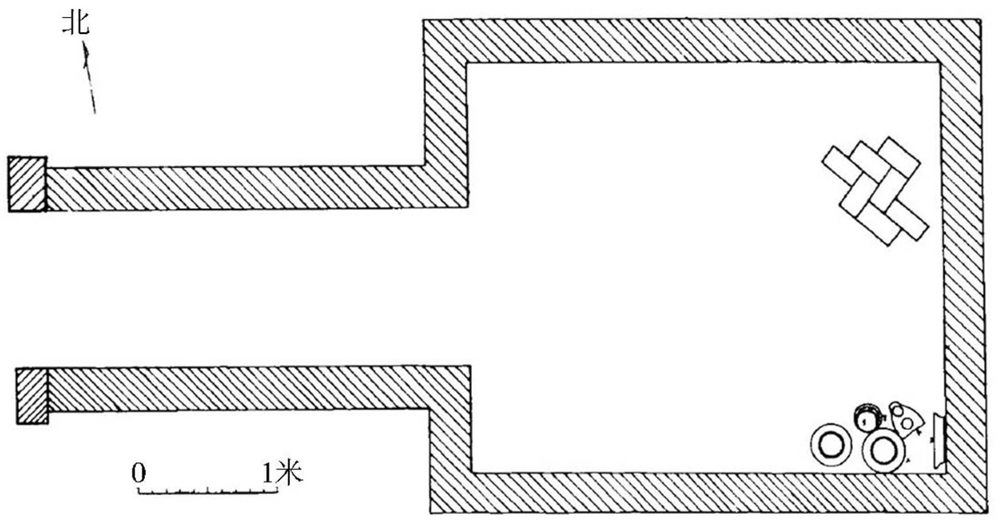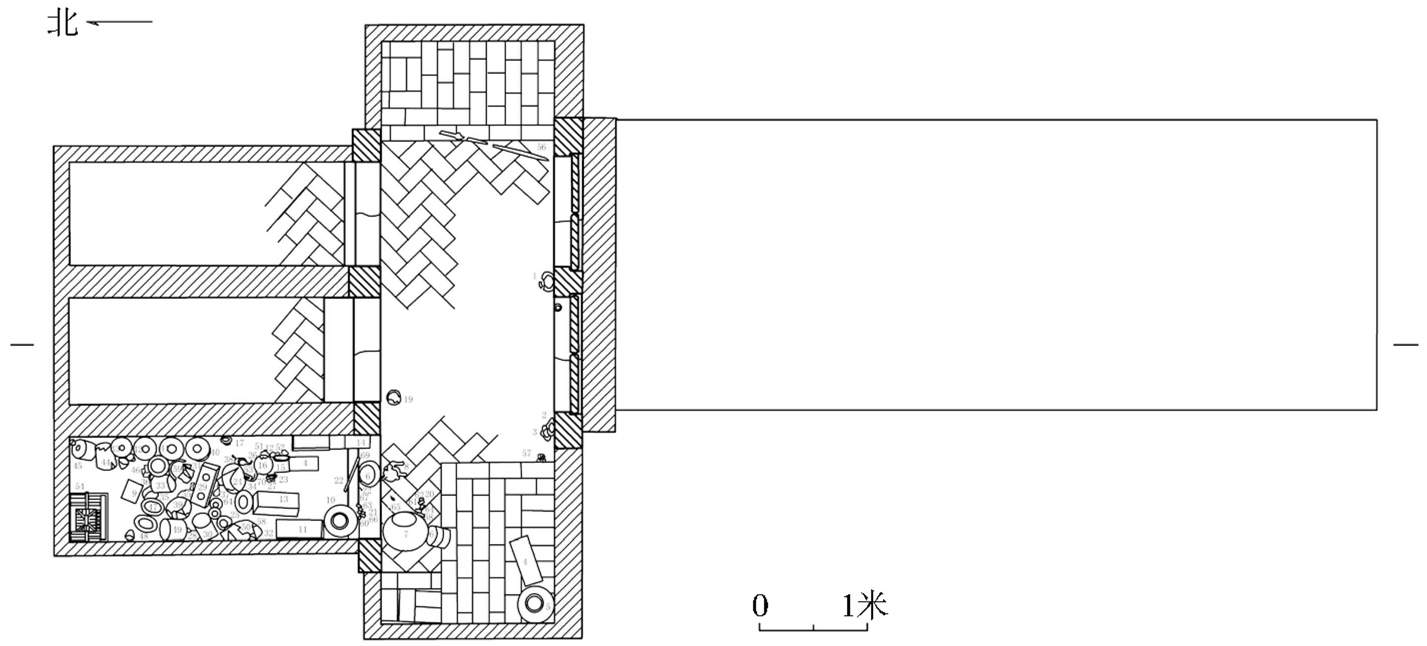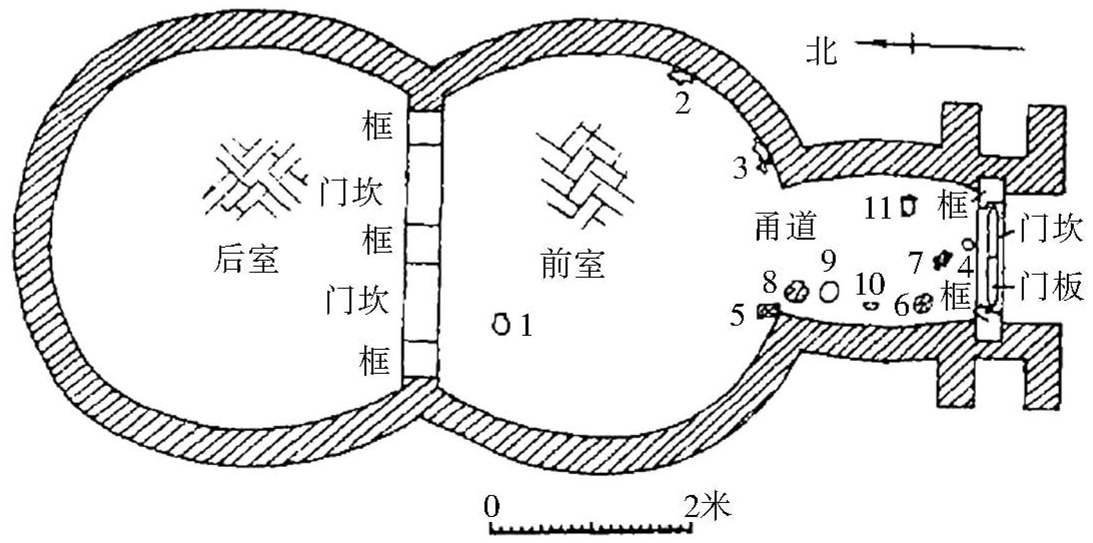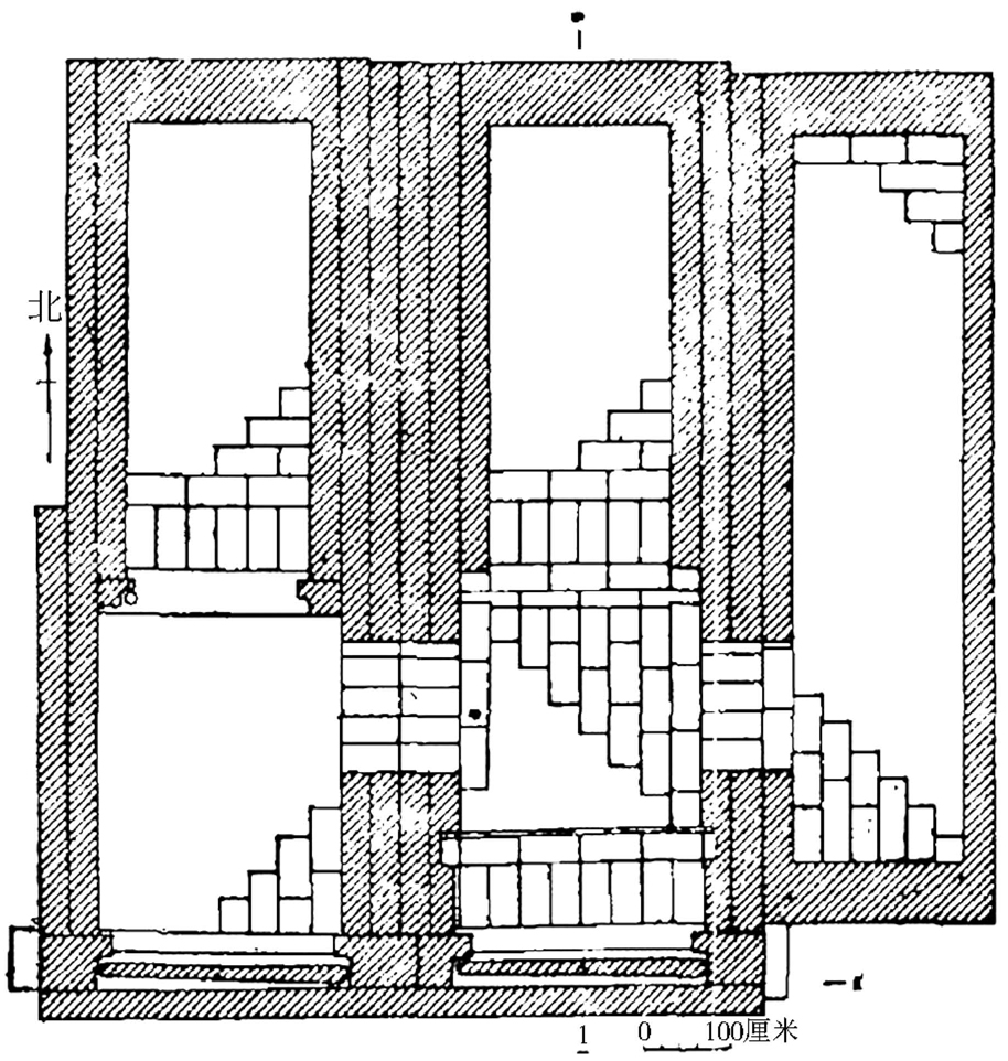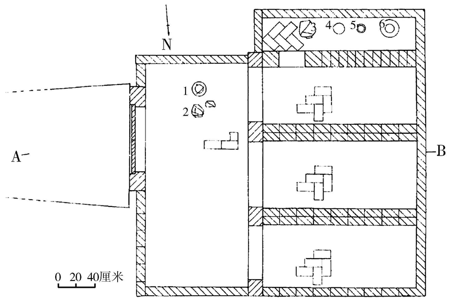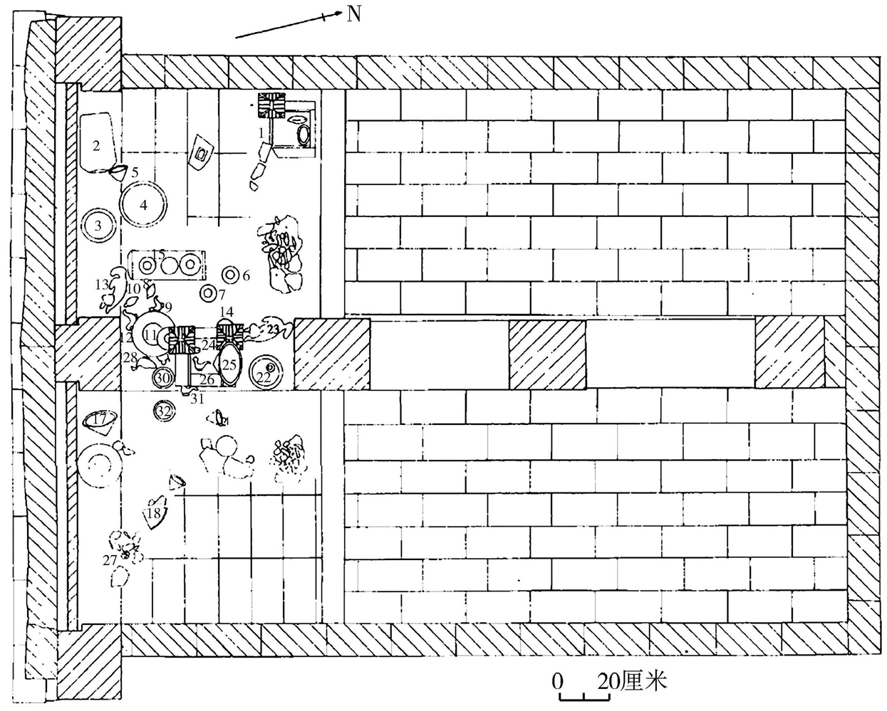 痕。土塚中央偏西的地方,发现一处盗洞,直径约1米。洞内填土松虚而较黄,其中遗留有少量夹纻漆器残片和汉代陶片。这个盗洞破坏了中室穹窿顶的北部,盗者从此进入墓内,将各室扰乱,墓内的随葬品遭到损失。墓道:为斜坡式,位于墓门和甬道之西,长9.4米、宽1.12米。它的西端距地表深2.4米,东端深0.9米。甬道:墓道与墓门之间,设有砖砌甬道,长2.04米、宽1.28米、残高0.82米。南北两壁以II式花纹砖(各式花纹砖或素面砖详后)平铺顺砌。砖长37厘米、宽17厘米、厚7.5厘米。铺地砖已被破坏。在墓道与甬道相接处,尚可见到一层封门砖,是利用三块半砖逐层平铺垒砌、封堵于甬道口。残存的一层封门砖平面排列呈弧形。砖长42厘米、宽17厘米、厚7厘米。墓门:位于前室之西,高1.45米、宽1.25米。门楣是由石1、门柱石2和门槛石1构成。门楣石长1.8米、宽0.23米、厚0.42米,正面刻画像一幅,向下的前侧棱处,刻一道门框槽。框槽的左右两端各刻一门枢窝,窝径10厘米、深0.45厘米。左右两门柱石表面粗糙,皆作方柱形,高约1.48米、厚0.24米,宽度则因下粗上细不等,右柱宽10—14厘米、左柱宽16—19厘米。门槛石的两端皆埋于土圹内,可知的长度为1.6米、宽0.29米、厚0.18米,已断成两截。发掘时已不见两扇石门。墓室:系砖石混合桔构,长11.6米,最宽处9.22米,由7个墓室构成。它的平面布局是:前室、中室和后室建筑在同一条中轴线上,皆设有石门可通。前室之北设一券门通往右前室;前室之南垒砌石门通往左前室。左前室之东砌有左后室,中间亦有券门可通。中室之北券砌右耳室;中室之南砌券门二以通左后室。前室:平面呈长方形,长3.87米、宽1.14米、高2.02米。南北两壁以小花纹砖平铺顺砌九层,然后发券,以“交错拜列券法”将室顶砌成弧券顶。南北两壁至室顶所砌花纹小砖的花纹是完全对称的,今举北壁为例,说明各层花纹砖的式样:最下砌XIX式小砖一层,其上依次砌V式砖一层、XIX式砖二层、V式砖一层(此层兼砌以素面小砖)、素面砖七层、V式砖八层(偶有将带花纹的砖侧砌向壁内的)、III式砖二层、V式砖一层、III式砖五层、V式砖一层、III式砖一层、III式与VI式砖混合券砌五层,券顶中央为III式和V式砖交错券砌。上述VI式花纹砖上印有“大吉”两字,砌时皆两两相对地砌入券顶上。或者每两块VI式砖间砌以一III式砖。铺地砖仅残存一部分,排列呈人字形,砖长40厘米、宽17厘米、厚8厘米。中室:位于前室之东,平面呈方形,东西长2.78米、宽2.44米、残高2.38米。西壁与前室相接处没有石门,门高1.32米、宽1.24米。门楣石已断为两截,残长约2.4米、宽0.28米、厚0.4米。石的正面和背面各刻画像一幅,向下一面前棱处,也刻出直角的门框槽,两端也各刻门枢窝一个。此石出土时,长的一段已倒塌于右耳室门外的淤土中,短的一段倒置于通往左后室的西券门之外。左右两门柱石形制与墓门的相似,高皆约1.32米,厚约0.26米;左柱最宽处0.2米,右柱最宽处0.24米。门槛石外露的长1.24米、宽0.26米、厚0.18米。此门在发掘时亦未发现有石门。中室北壁以XIX式小砖交错顺砌,现残存17层。在靠近西北隅的地方以XIX式及XXI万式小砖砌成双弧券门,即为右耳室门,门高1.06米,最宽处1.02米。券门顶上尚承托残存的中室穹窿顶砖18层,其砌法以XII式、XIII式、XI式、XII式、XIV式、XVII式、XVIII式小花纹砖逐层叠涩垒砌,但每向上垒砌一层其圆周半径皆缩小4—6厘米。中室南壁券砌两个并列的券门以通往左后室。由于室顶和券门塌毁,残高0.6—0.9米。南侧门宽0.84米,北侧门宽约0.96米。两门皆系双弧券。两门间所夹的砖柱亦以IX式小砖垒砌,东西长0.58米、南北宽0.8米、残高0.7米,用以承托穹窿顶南部和支撑左后室盝顶北部。中室东壁中央设石门一道,通往后室,门高约1.52米,最宽处约1.12米。门楣石已不存,左右门柱石与上述两门的相似,高约1.14米、厚约0.23米、宽0.2米。门槛石长约0.85米、宽0.26米、最厚处0.22米。此门左右两侧的东壁皆以XIX式小砖错缝顺砌,唯门右(东壁右边)壁面上曾涂白粉,上施朱绘,已模糊不清。门券顶上亦残存穹窿顶,大体皆以VII、VIII、XII、XIV、XVI、XVIII等式花纹砖混合逐层垒砌,共砌法与右耳室券门上部相同。小砖印有花纹的一端皆砌向室内,印有文字的一端皆朝向室外。由于中室的下部为方形,顶为穹窿形,故穹窿顶四隅衔接处,全用特制的花纹小砖垒砌。从中室穹窿顶塌陷的花纹砖可以推知四隅结构与后室完全相同,系以VII—XIII式花纹砖混合垒砌的。中室铺地砖有两层,上一层为长宽36厘米、厚7厘米的方形砖。纵铺六行,横铺七行。周边皆不与四壁紧密接联,而高出壁基约7厘米。北壁下留有较宽的空隙,露出第二层铺地砖。下一层系小砖并列横铺,砖长42厘米、宽17厘米、厚7厘米。后室:位于中室之东,平面亦呈方形,东西长2.64米、南北宽2.68米、残高2.55米。它与中室之间的门道,西砌石门东砌小砖券门,门道长0.44米、南北宽1.1米、高1.83米。从残存部分砌砖看,其券法是以XIX式砖平铺顺砌14层后开始起券。券上是砌以XXI式砖一层、II式砖一层,XXI砖二层,II式砖一层,最后以XXI式砖砌成双弧券顶。券顶之上,以并列的数块子母砖平铺垒砌。甬道铺地砖亦以四块方形砖平铺成甬路式。后室四壁平直,皆用XIX式小砖错缝顺砌至17层后,再用特制小砖将方形的四隅缩成弯窿顶。四壁和穹窿顶衔接的结构保存较佳,尤以西北隅最为