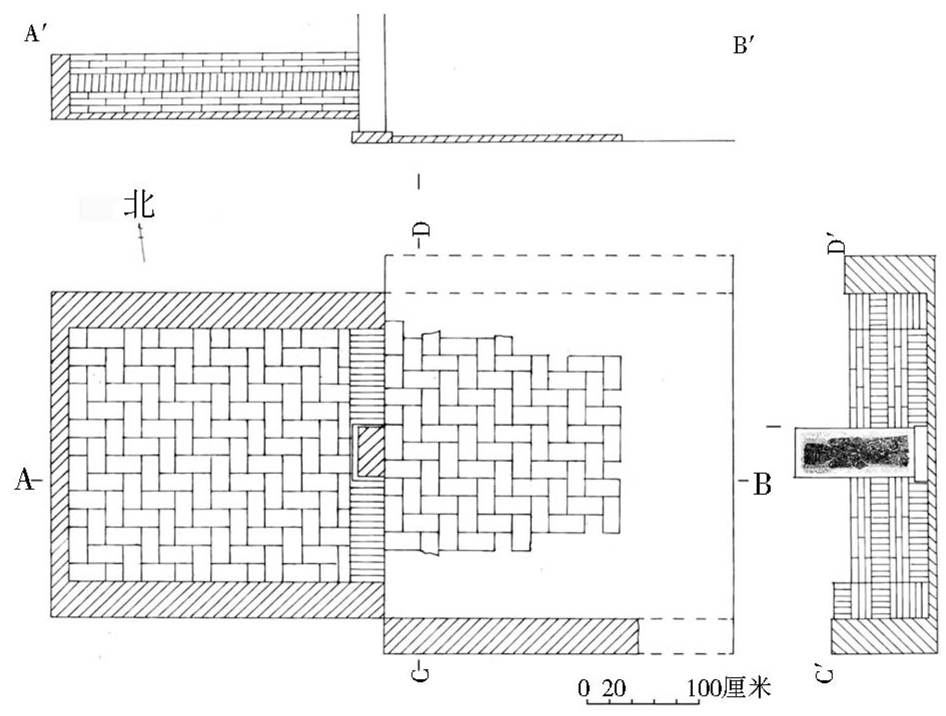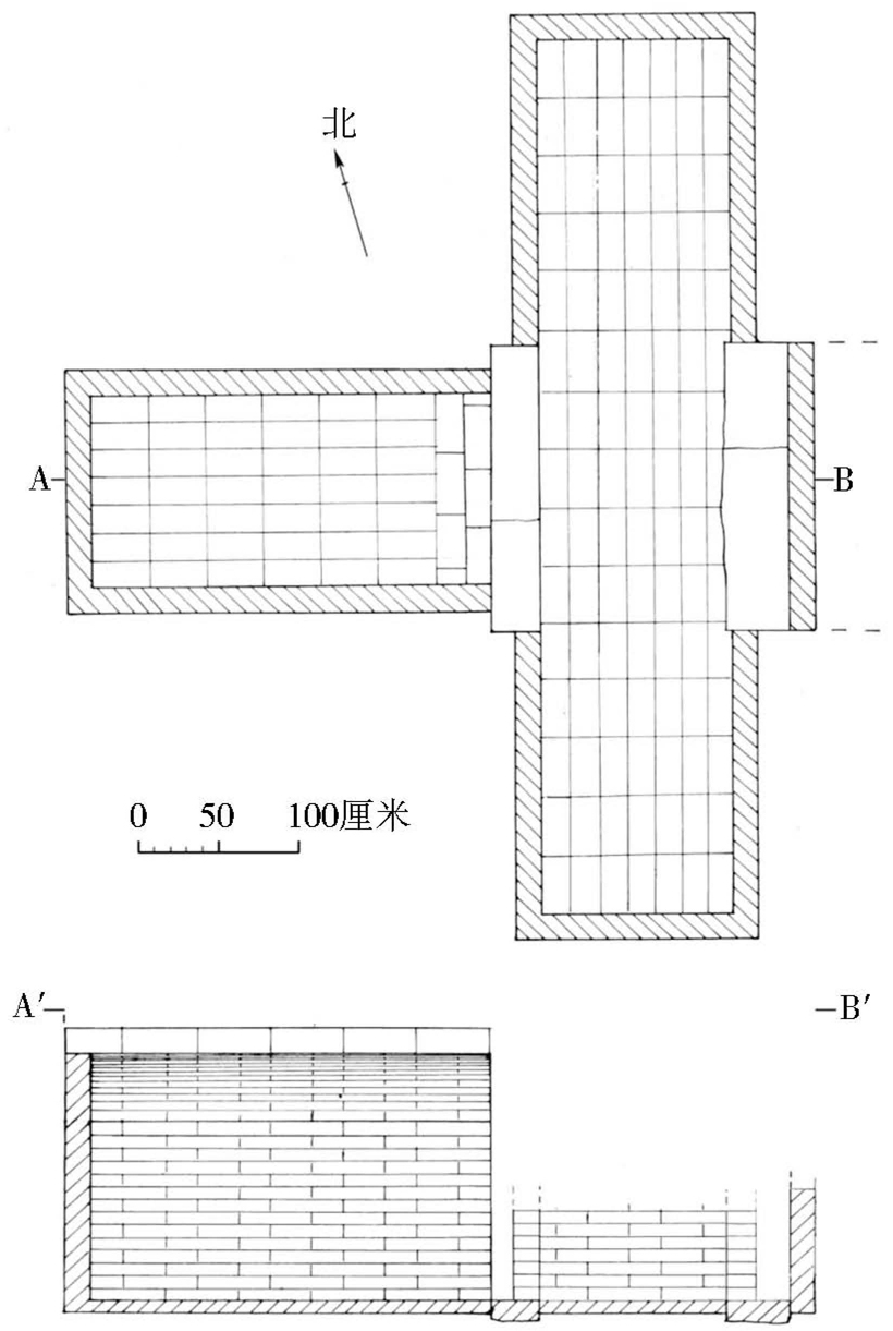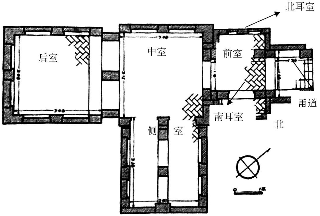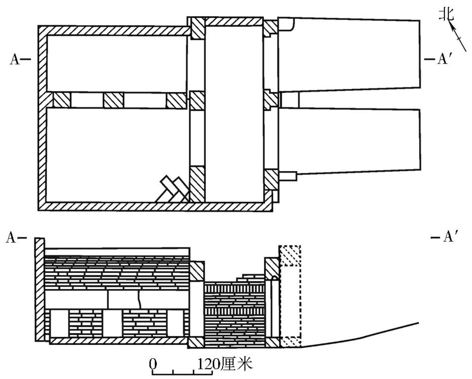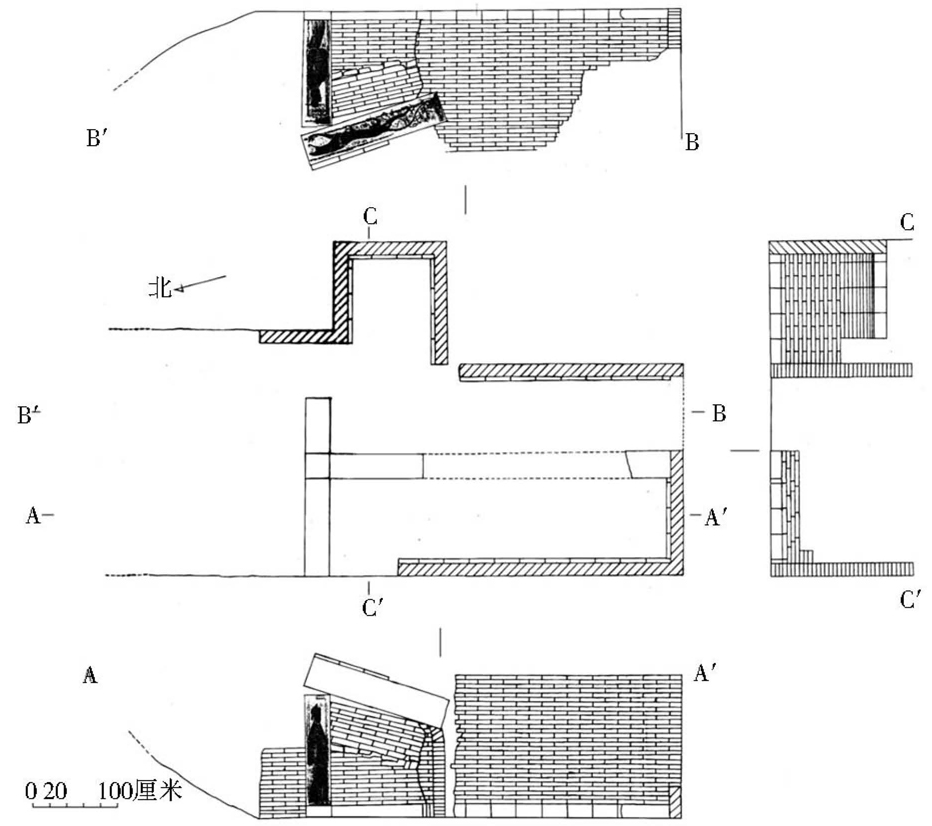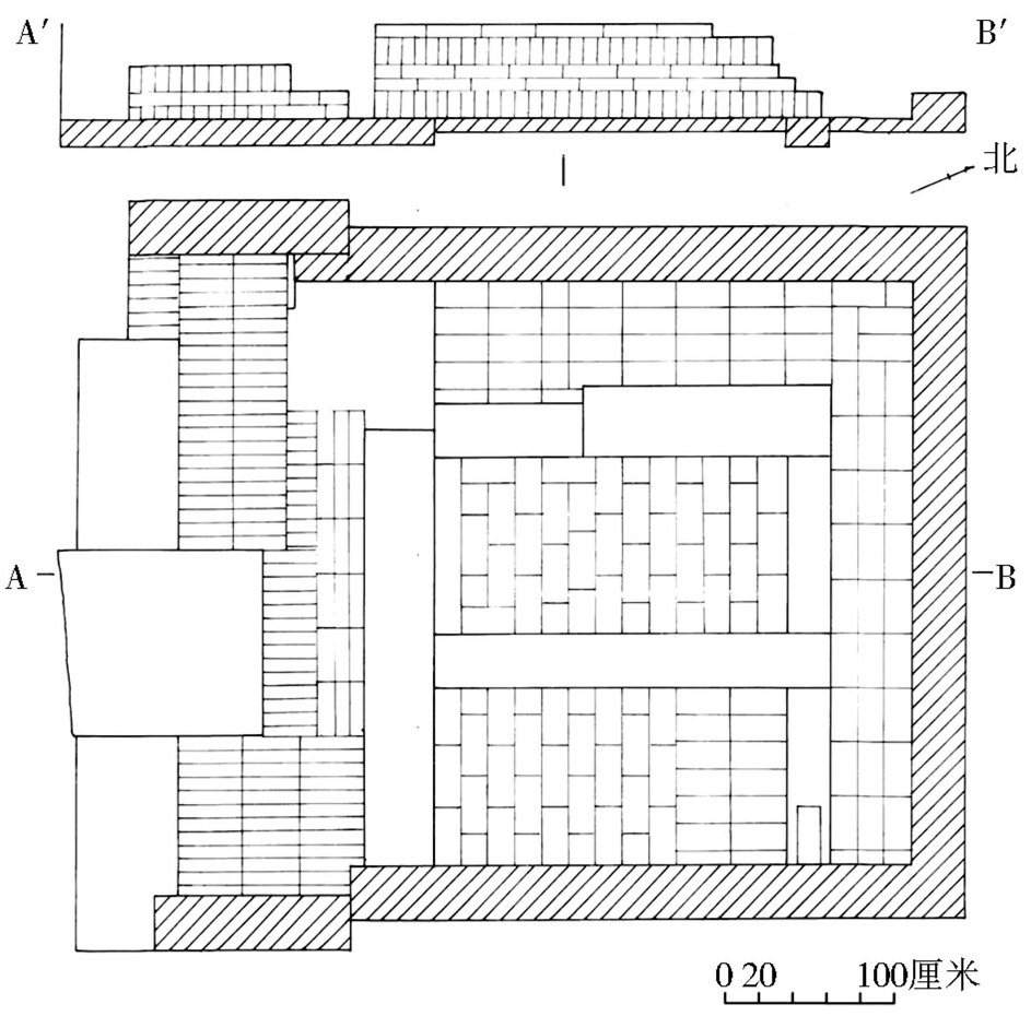 痕迹历历可辨。墓葬券顶高出地面约1.5米。墓室系用63块石灰岩条石与大量小砖混合砌筑而成,分墓门、前室、二主室及四侧室八个部分。平面呈“品”字形。墓室内全长5.88米、宽8.24米、高3.56米。墓门用门楣、槛石和二立柱构成,高1.3米、宽1.14米。门框内沿雕凿凹槽和门枢窝,安装门扉两扇。前室方形,南北阔2.69米、东西进深2.75米、高3.56米,地面低于二主室及四侧室0.24米。前室东壁即墓门内壁,南、西、北三壁分别为南二侧室、二主室和北二侧室之门。顶部用小砖券筑为盈顶。底部用小砖平铺作“人”字形。小砖为灰色泥质,长34厘米、宽17厘米、厚6厘米。主室长方形,中间用石柱和石梁隔离成南北并列的两室。两室的前边用二门楣、二槛石、三立柱构成并列的二门,各安装门扉两扇。门高1.08米、宽1.03米。作为两室隔壁用的三立柱之间有二小门可以相通。两室各长2.75米,南主室宽1.02米,北主室宽1米,通高1.55米。两室后壁及南主室南壁和北主室北壁均用小砖砌成。两室顶部用砖券作东西并列的两个拱形券。券顶系用小砖和斧刃砖相间券筑而成,斧刃砖刃厚3.5厘米。铺底砖的铺法与前室相同。侧室前室南北两侧各有并列的二侧室,大小与二主室相同。