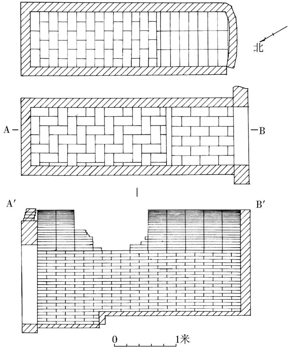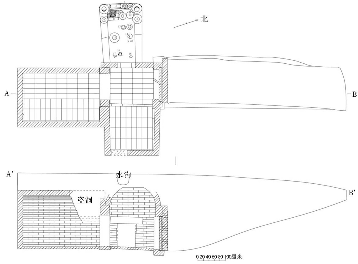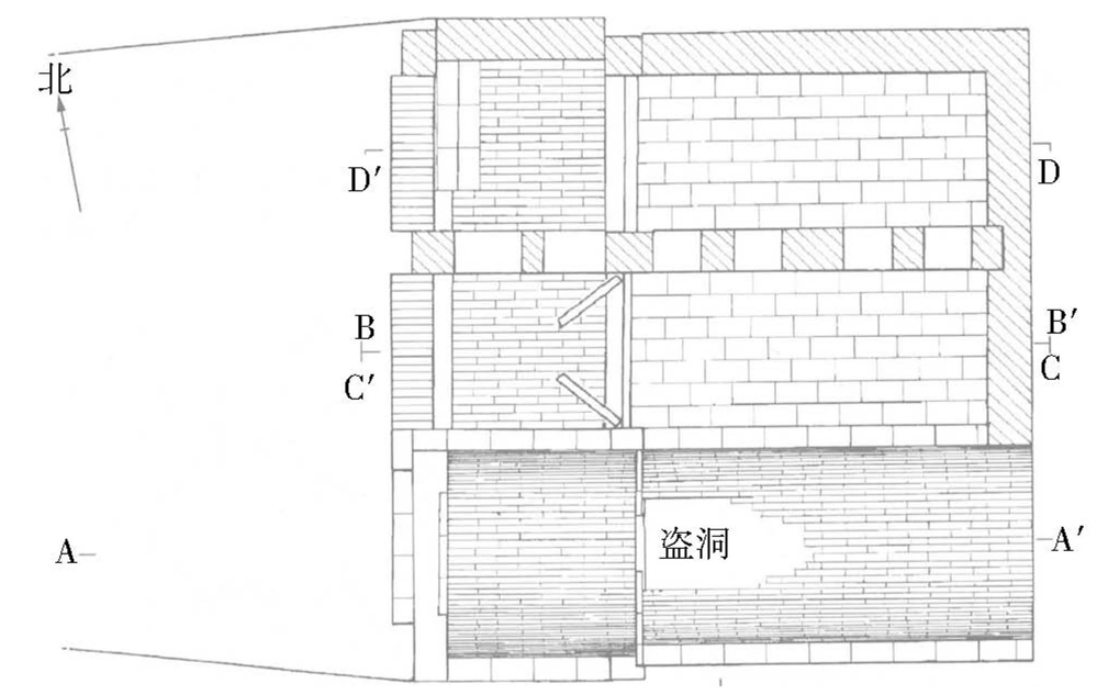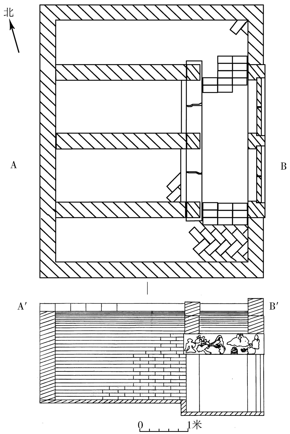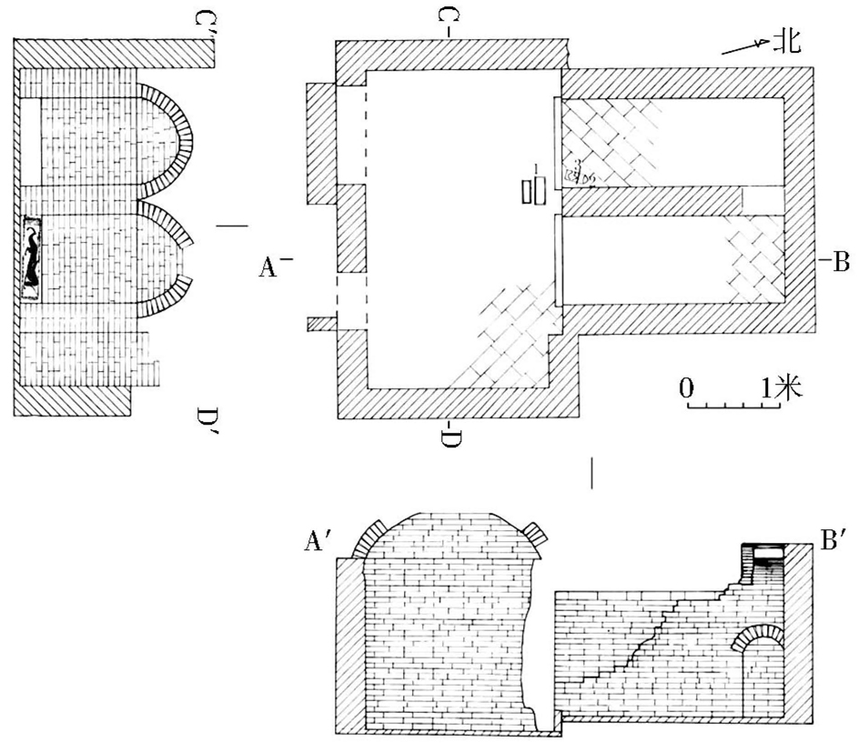 痕迹历历可辨。墓葬券顶高出地面约1.5米。墓室系用63块石灰岩条石与大量小砖混合砌筑而成,分墓门、前室、二主室及四侧室八个部分。平面呈“品”字形。墓室内全长5.88米、宽8.24米、高3.56米。墓门用门楣、槛石和二立柱构成,高1.3米、宽1.14米。门框内沿雕凿凹槽和门枢窝,安装门扉两扇。前室方形,南北阔2.69米、东西进深2.75米、高3.56米,地面低于二主室及四侧室0.24米。前室东壁即墓门内壁,南、西、北三壁分别为南二侧室、二主室和北二侧室之门。顶部用小砖券筑为盈顶。底部用小砖平铺作“人”字形。小砖为灰色泥质,长34厘米、宽17厘米、厚6厘米。主室长方形,中间用石柱和石梁隔离成南北并列的两室。两室的前边用二门楣、二槛石、三立柱构成并列的二门,各安装门扉两扇。门高1.08米、宽1.03米。作为两室隔壁用的三立柱之间有二小门可以相通。两室各长2.75米,南主室宽1.02米,北主室宽1米,通高1.55米。两室后壁及南主室南壁和北主室北壁均用小砖砌成。两室顶部用砖券作东西并列的两个拱形券。券顶系用小砖和斧刃砖相间券筑而成,斧刃砖刃厚3.5厘米。铺底砖的铺法与前室相同。侧室前室南北两侧各有并列的二侧室,大小与二主室相同。