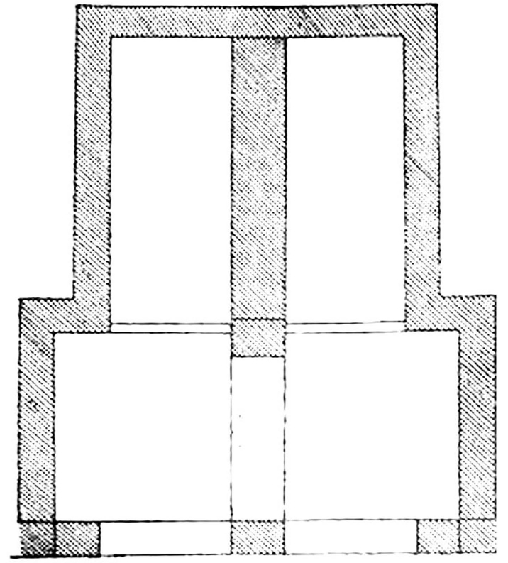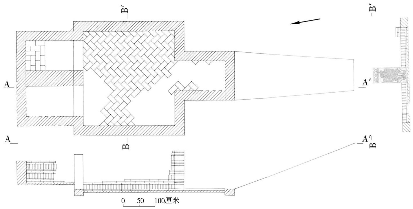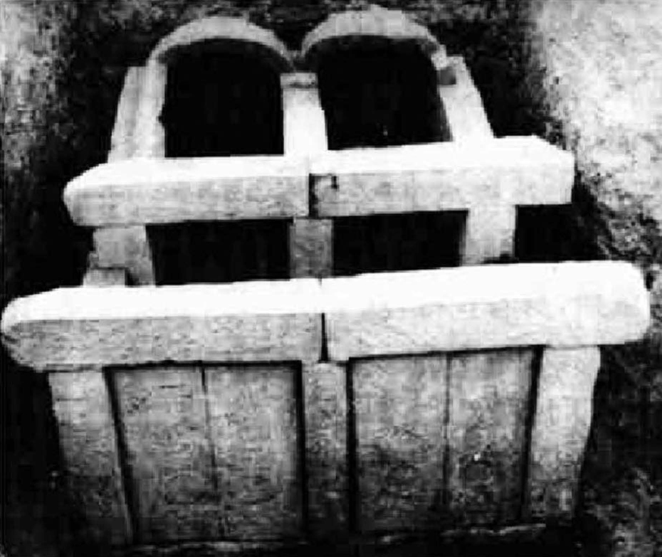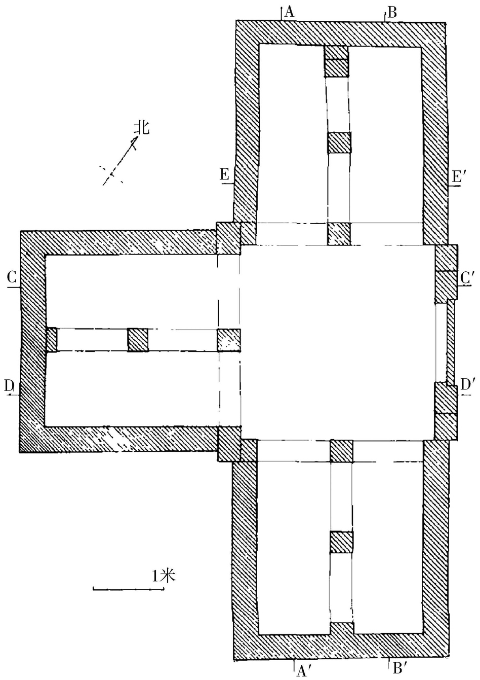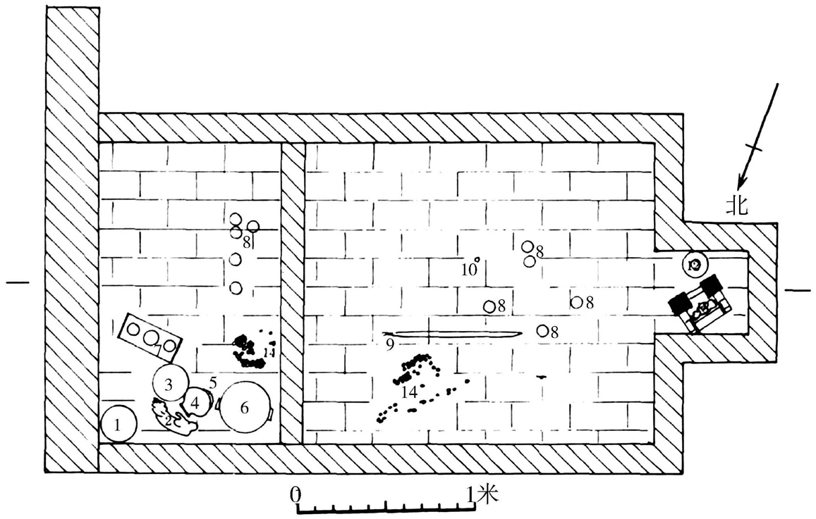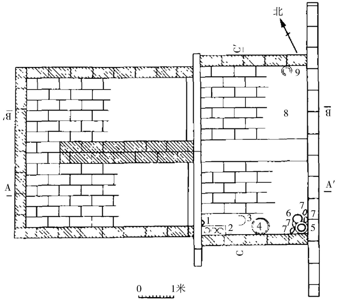 痕迹历历可辨。墓葬券顶高出地面约1.5米。墓室系用63块石灰岩条石与大量小砖混合砌筑而成,分墓门、前室、二主室及四侧室八个部分。平面呈“品”字形。墓室内全长5.88米、宽8.24米、高3.56米。墓门用门楣、槛石和二立柱构成,高1.3米、宽1.14米。门框内沿雕凿凹槽和门枢窝,安装门扉两扇。前室方形,南北阔2.69米、东西进深2.75米、高3.56米,地面低于二主室及四侧室0.24米。前室东壁即墓门内壁,南、西、北三壁分别为南二侧室、二主室和北二侧室之门。顶部用小砖券筑为盈顶。底部用小砖平铺作“人”字形。小砖为灰色泥质,长34厘米、宽17厘米、厚6厘米。主室长方形,中间用石柱和石梁隔离成南北并列的两室。两室的前边用二门楣、二槛石、三立柱构成并列的二门,各安装门扉两扇。门高1.08米、宽1.03米。作为两室隔壁用的三立柱之间有二小门可以相通。两室各长2.75米,南主室宽1.02米,北主室宽1米,通高1.55米。两室后壁及南主室南壁和北主室北壁均用小砖砌成。两室顶部用砖券作东西并列的两个拱形券。券顶系用小砖和斧刃砖相间券筑而成,斧刃砖刃厚3.5厘米。铺底砖的铺法与前室相同。侧室前室南北两侧各有并列的二侧室,大小与二主室相同。